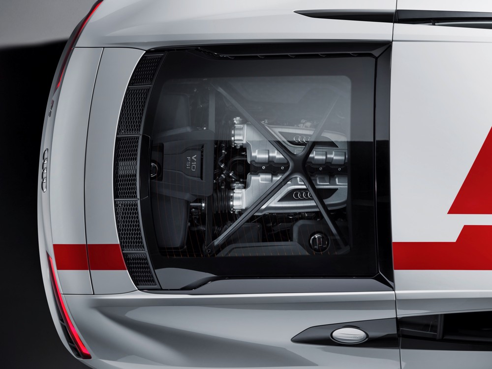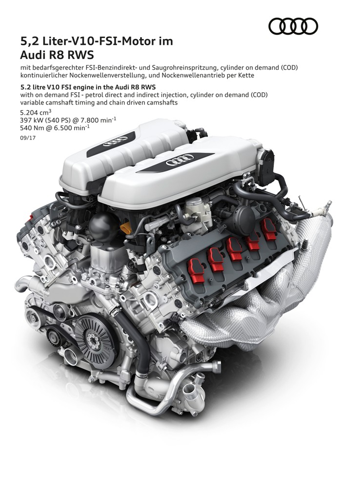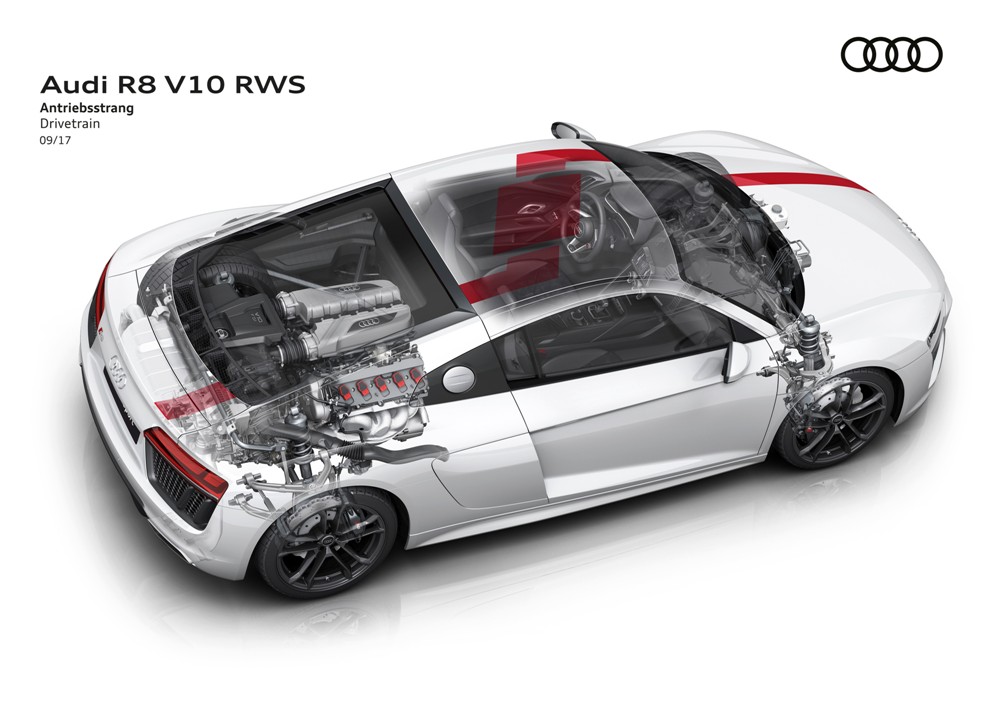 A nivel mecánico, el R8 V10 RWS se basa en el R8 V10 de acceso a gama, el cual equipa el motor V10 FSI atmosférico de 5.2 litros con una potencia de 540 CV y un par motor de 540 Nm disponibles desde las 6.500 rpm. Disponible tanto en carrocería coupé como descapotable, registra velocidades máximas de 320 km/h en el de techo duro y 318 km/h en el de lona, así como un paso de cero a 100 km/h en 3,7 segundos para el coupé y en 3,8 segundos para el Spyder.