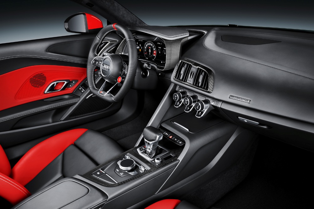 Una vez en la cabina del Audi R8 V10 Sport Edition encontramos placas específicas en los pasos de puerta con la denominación Audi Sport y el número de la edición limitada, cuero Nappa que envuelve los asientos y los paneles de las puertas, en negro y rojo con terminación en rombo. El emblema R8 está grabado en los respaldos de los asientos como elemento de diseño único de la edición, así como costuras en contraste plateadas, inserciones en carbono y otros detalles.