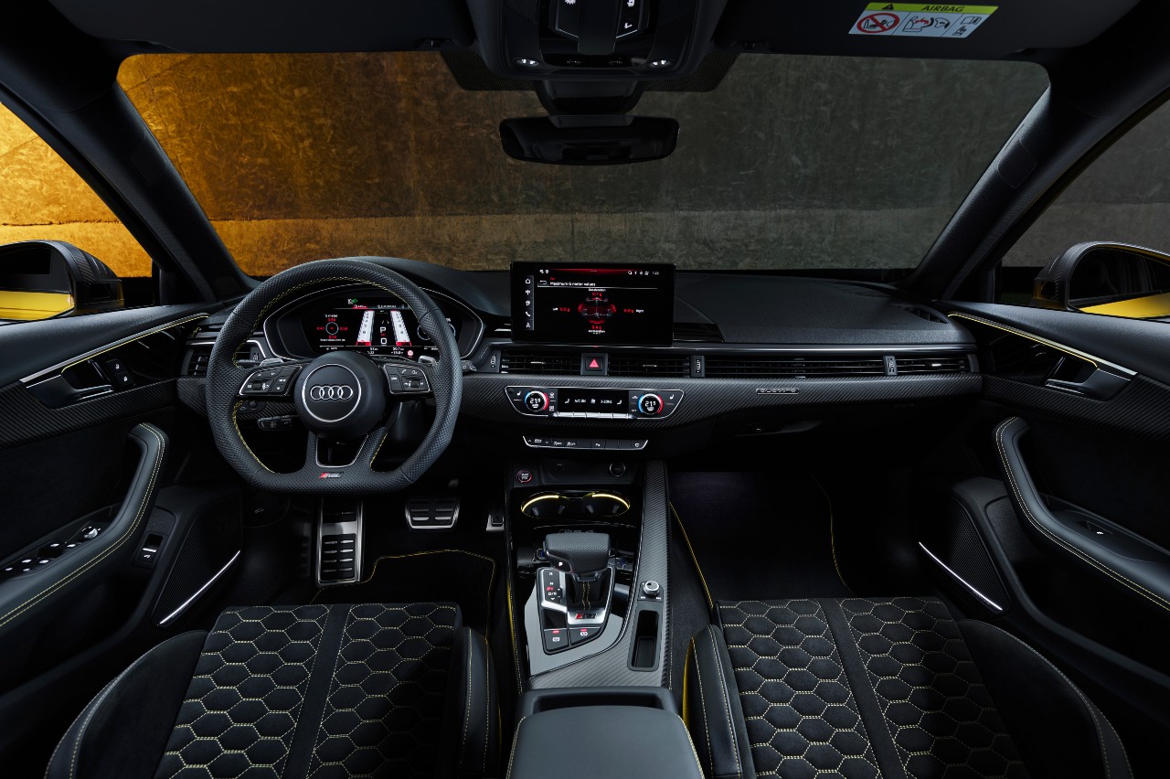 En el interior del RS 4 Avant edition 25 years también encontramos varios detalles que nos recuerdan que estamos ante una edición muy especial. Los asientos tienen unas costuras amarillas inspiradas en la combinación de cuero y Alcantara negro y amarillo del RS4 de 2001. Por primera vez, las alfombrillas incorporan el logotipo RS 4 y tanto el tradicional rombo rojo de Audi Sport como el rótulo RS negro también son amarillos en este modelo.