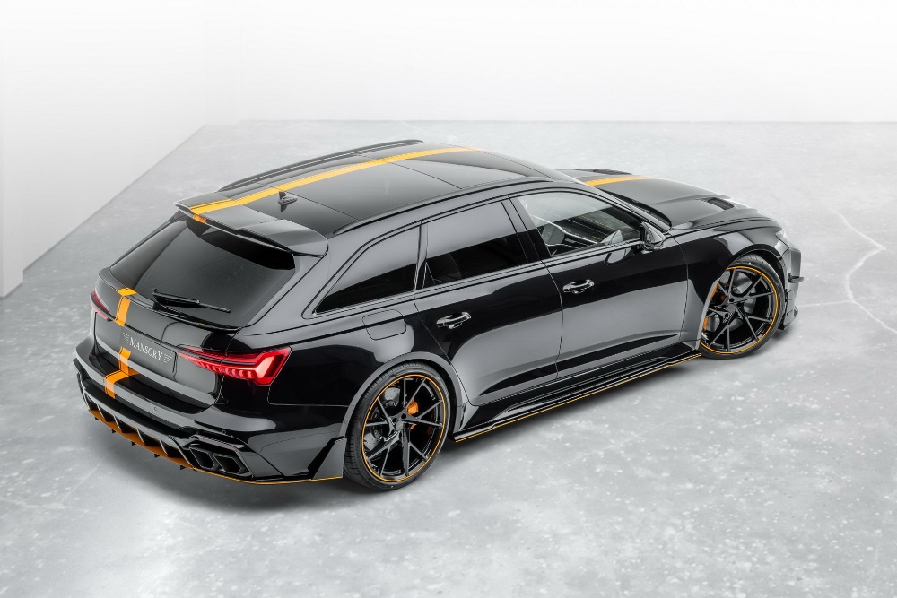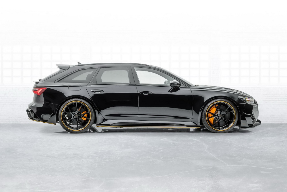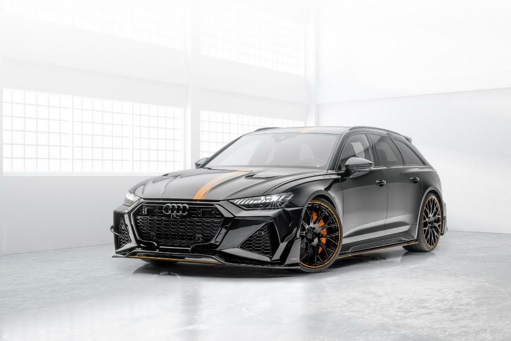 Para empezar, el preparador instaló un kit de carrocería completo a la carrocería del Audi RS 6 Avant 2020, el cual está compuesto por un nuevo splitter delantero, taloneras laterales, un faldón trasero y un difusor con cuatro salidas de escape cuadradas, un alerón sobre el techo y otro sobre el portón del maletero, debajo de la luneta posterior, y un nuevo capó con dos salidas de aire. El exterior se completa con un juego de llantas ligeras forjadas de 22 pulgadas y un esquema de pintura en color negro con una franja en naranja que recorre todo el largo de la carrocería y se refleja en el splitter, el difusor, las taloneras y las llantas.