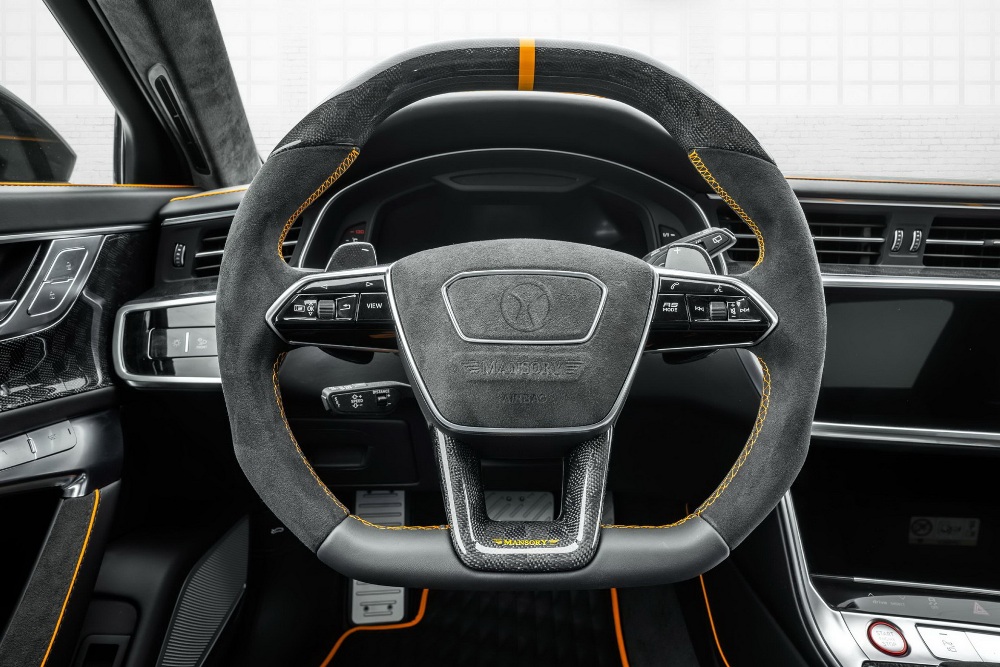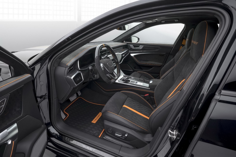 Por último, el interior del RS 6 Avant de Mansory también recibe algunos cambios estéticos, con tapicería de cuero y Alcantara que cubre todas las superficies, desde los asientos hasta el tablero y desde los paneles de las puertas hasta el revestimiento del techo interior, con una franja naranja que combina con el estilo exterior. Destacan también las costuras en naranja, las alfombrillas personalizadas o el volante deportivo totalmente recubierto en Alcantara.