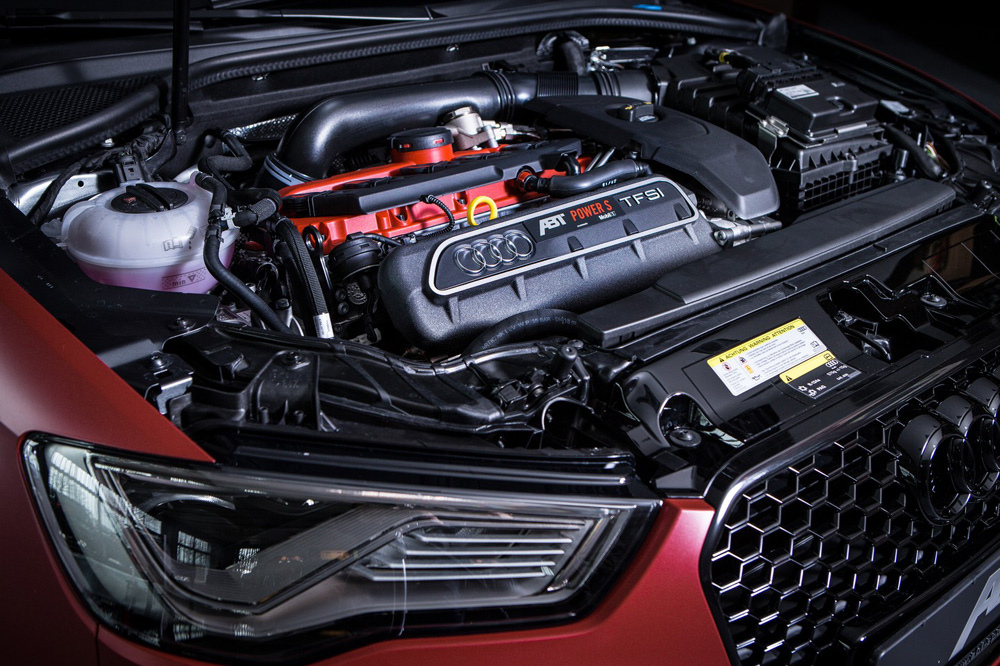 Pero lo más interesante del RS3 Sportback preparado por ABT se esconde bajo su capó. El motor 2.5 TFSI de cinco cilindros en línea, que pasa de entregar 367 CV y 465 Nm a generar 450 CV y 550 Nm de par, un incremento de 83 CV y de 85 Nm. Con ese extra de potencia, ahora es capaz de acelerar de 0 a 100 km/h en 4 segundos y de alcanzar una velocidad máxima limitada electrónicamente a 290 km/h, mejorando así en 0,3 segundos el registro de 0 a 100 km/h e incrementando la velocidad punta en 10 km/h (el RS3 de serie llega a 280 km/h si equipa el paquete opcional que eleva la velocidad máxima).