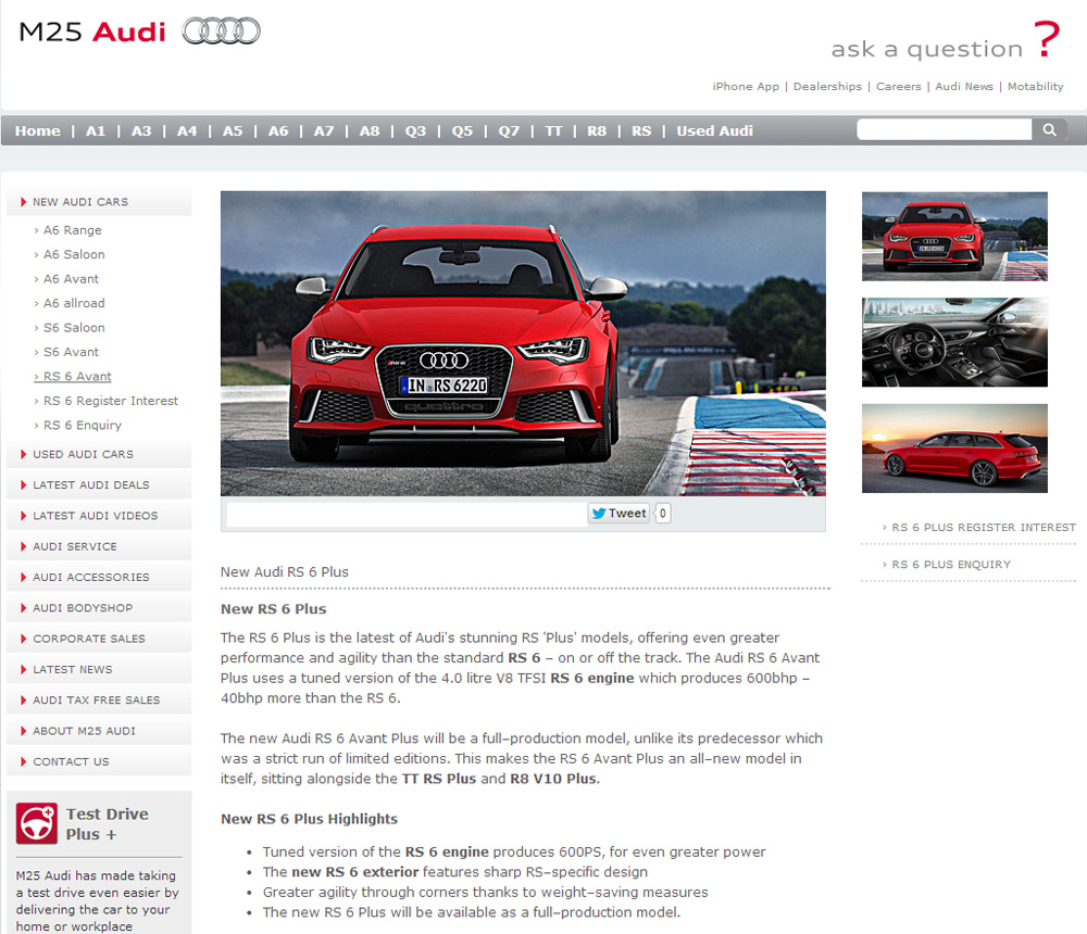 Un concesionario Audi de Gran Bretaña ha publicado por error una página en la que anuncia un nuevo modelo Plus. No se trata del R8 plus, ni del Audi TT RS plus (prueba), sino del Audi RS6 Avant plus, la variante más bestia del familiar de altas prestaciones.