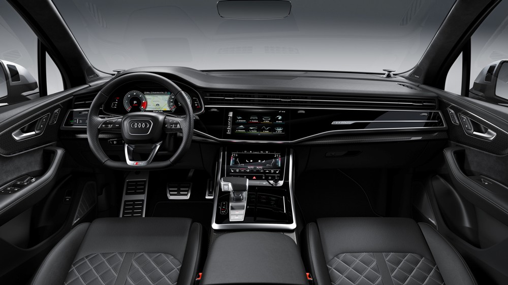 En el interior, el SQ7 TDI 2020 combina cuero y Alcantara, detalles en aluminio cepillado o fibra de carbono. Unos asientos deportivos S plus disponibles en diferentes colores, un sistema de iluminación ambiental con hasta 30 colores ajustables, el MMI Navegación plus de serie, climatizador de cuatro zonas, sistema de sonido Bang & Olufsen, faros HD Matrix LED con luz láser opcionales, asistente de conducción adaptativo, control longitudinal y lateral del vehículo y una amplia variedad de sistemas de seguridad y asistencia a la conducción.