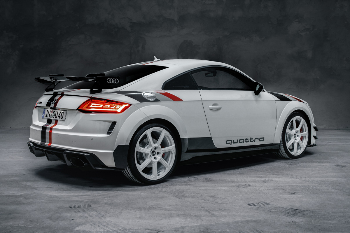 De entrada, esta edición especial del Audi TT luce una decoración específica tanto en el exterior como en el interior. Por fuera, presenta un color ‘Alpine White’ combinado con unas pegatinas en el capó, aletas traseras, techo y zaga que están inspiradas en el Audi Sport quattro S1 con el que Walter Röhrl conquistó Pikes Peak en 1987. Ese mismo tono está presente en las llantas de aleación de 20 pulgadas, que alojan en su interior unos frenos con pinzas rojas.