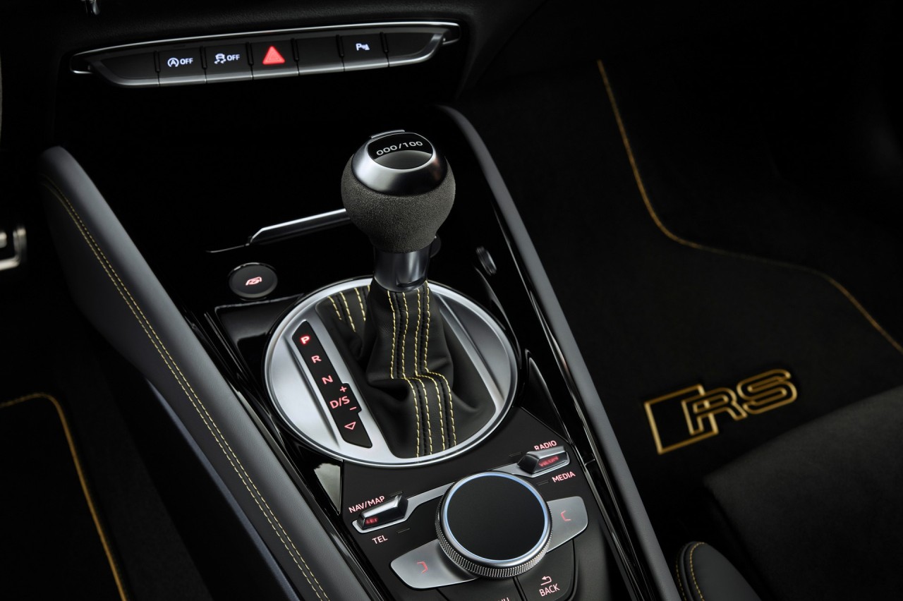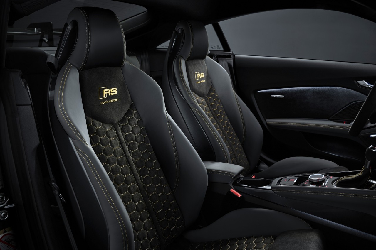 En el interior del Audi TT RS Iconic Edition podemos encontrar asientos deportivos RS de serie con paneles laterales en Nappa gris jet y paneles centrales en Alcantara negra. Las costuras en un patrón de panal de abeja amarillas, el bordado ‘Iconic Edition’ en los respaldos de los asientos delanteros, diferentes superficies terminadas en Alcantara con costuras amarillas y una placa numerada en el pomo de la palanca de cambios completan la lista de mejoras específicas de esta edición limitada.