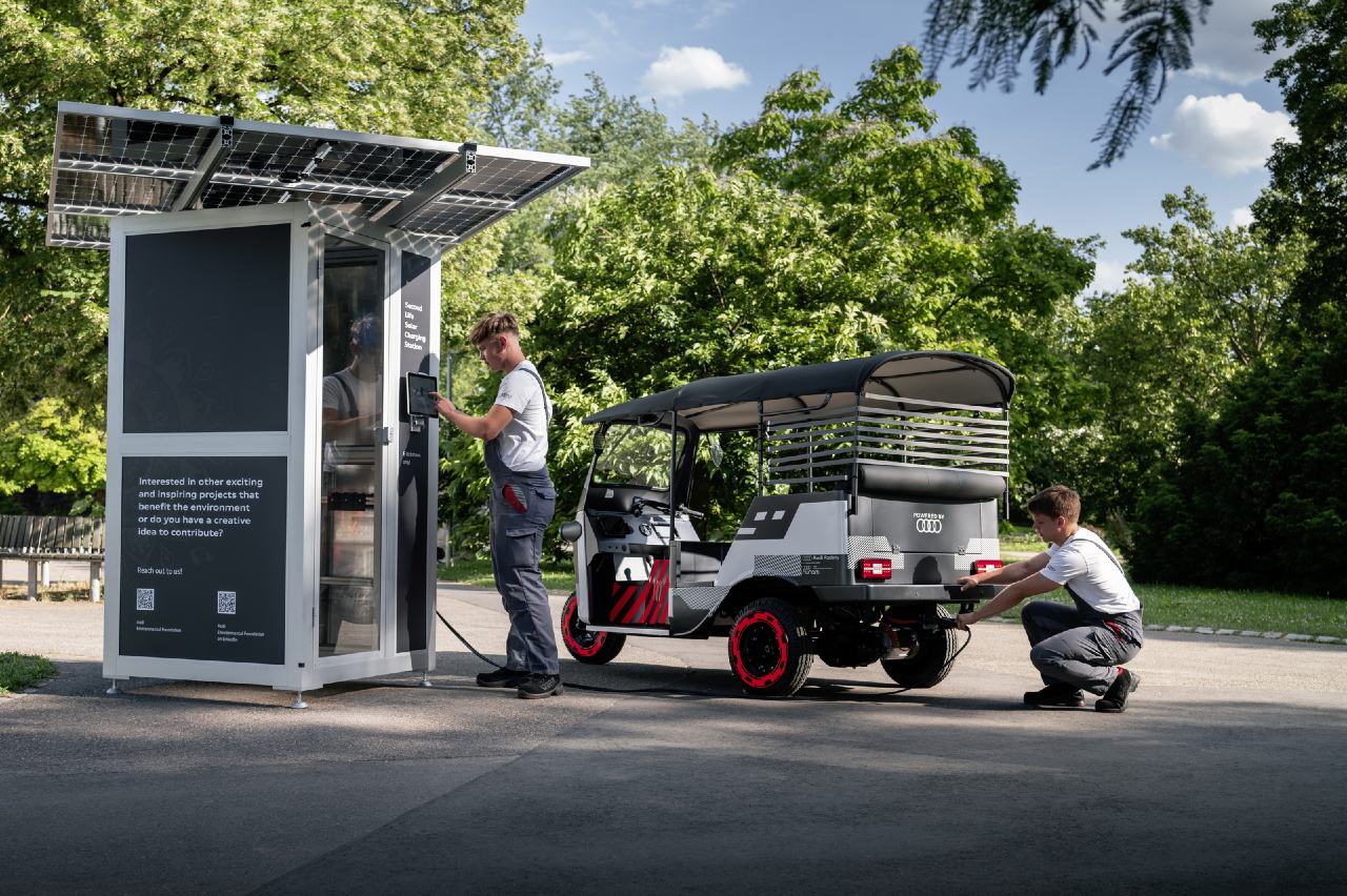 Durante el día, la luz solar carga la batería de un e-tron, que hace las veces de unidad intermedia de almacenamiento. Por la noche, la energía se transfiere a los tuk-tuk y así el proceso está prácticamente libre en emisiones de carbono.