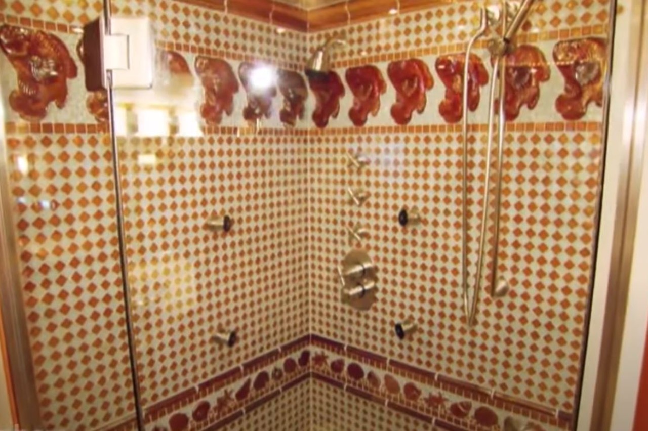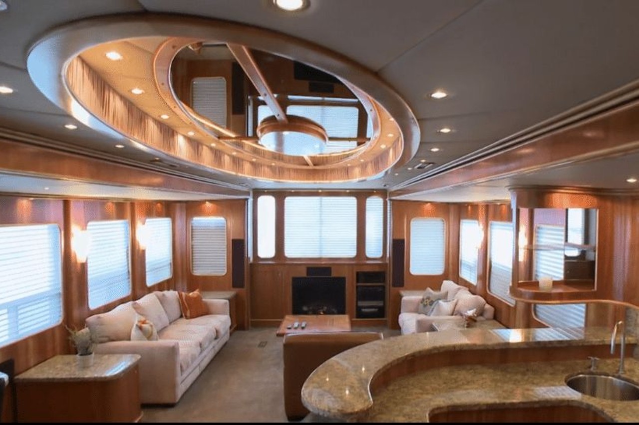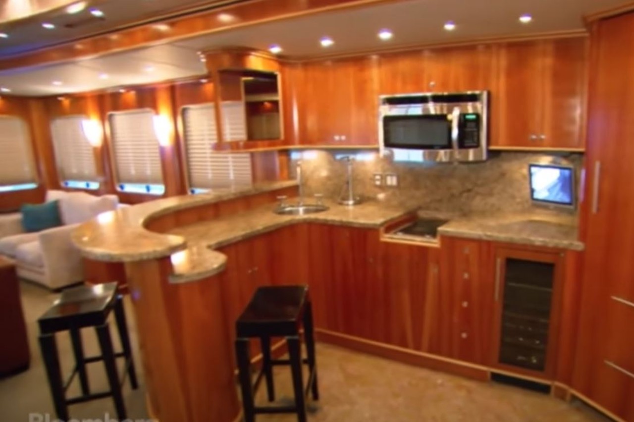 La autocaravana mide 16 metros de largo y tiene cuatro salidas que duplican el espacio interior disponible. Hay una sala de estar junto al comedor, con una cocina profesional personalizada, hecha de mármol y granito, y equipada con nevera y congelador de tamaño completo, una barra de bar y numerosos compartimentos de madera. Bajo el techo con espejo, hay un gran sofá de cuero en la sala de estar.