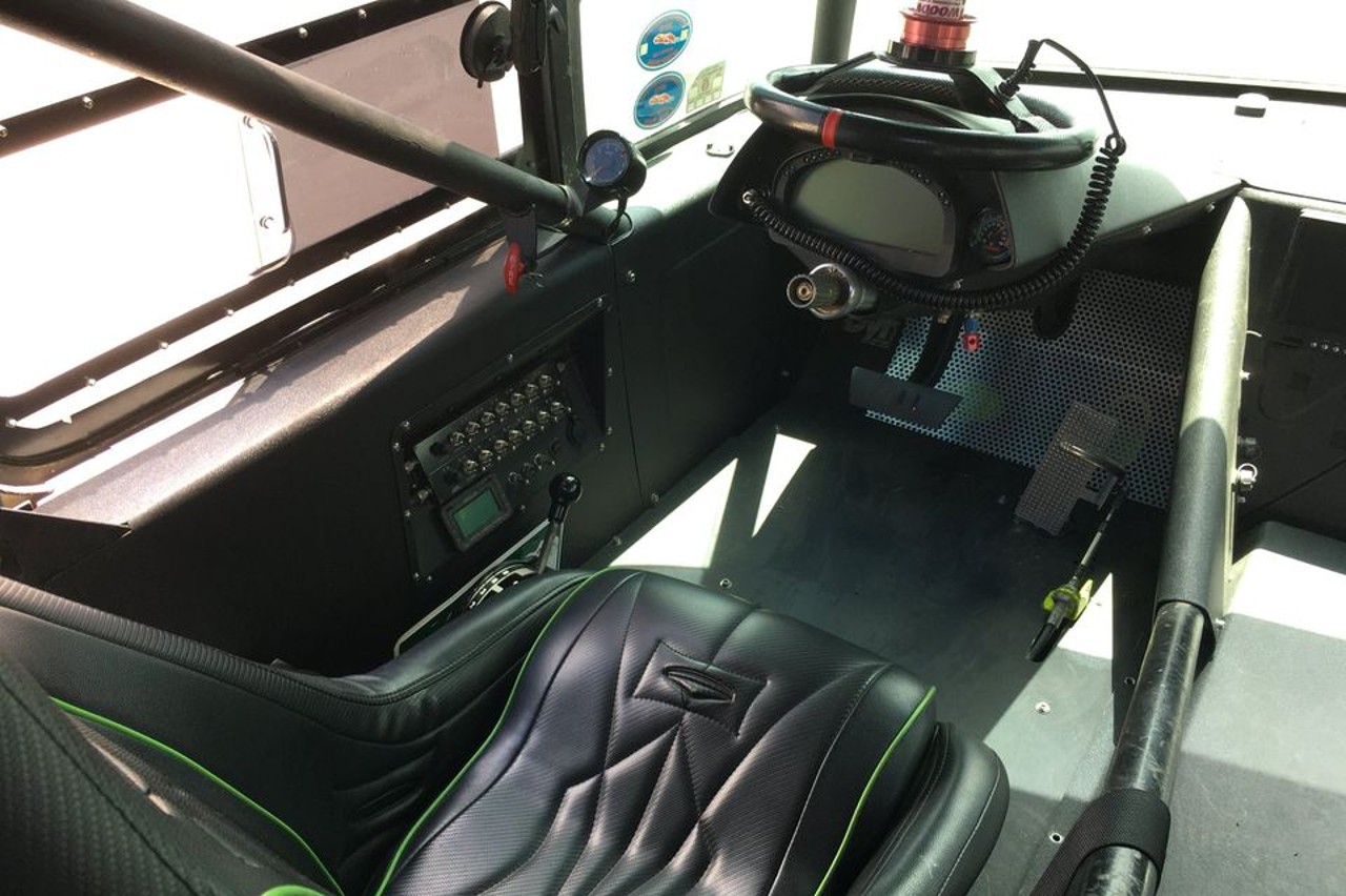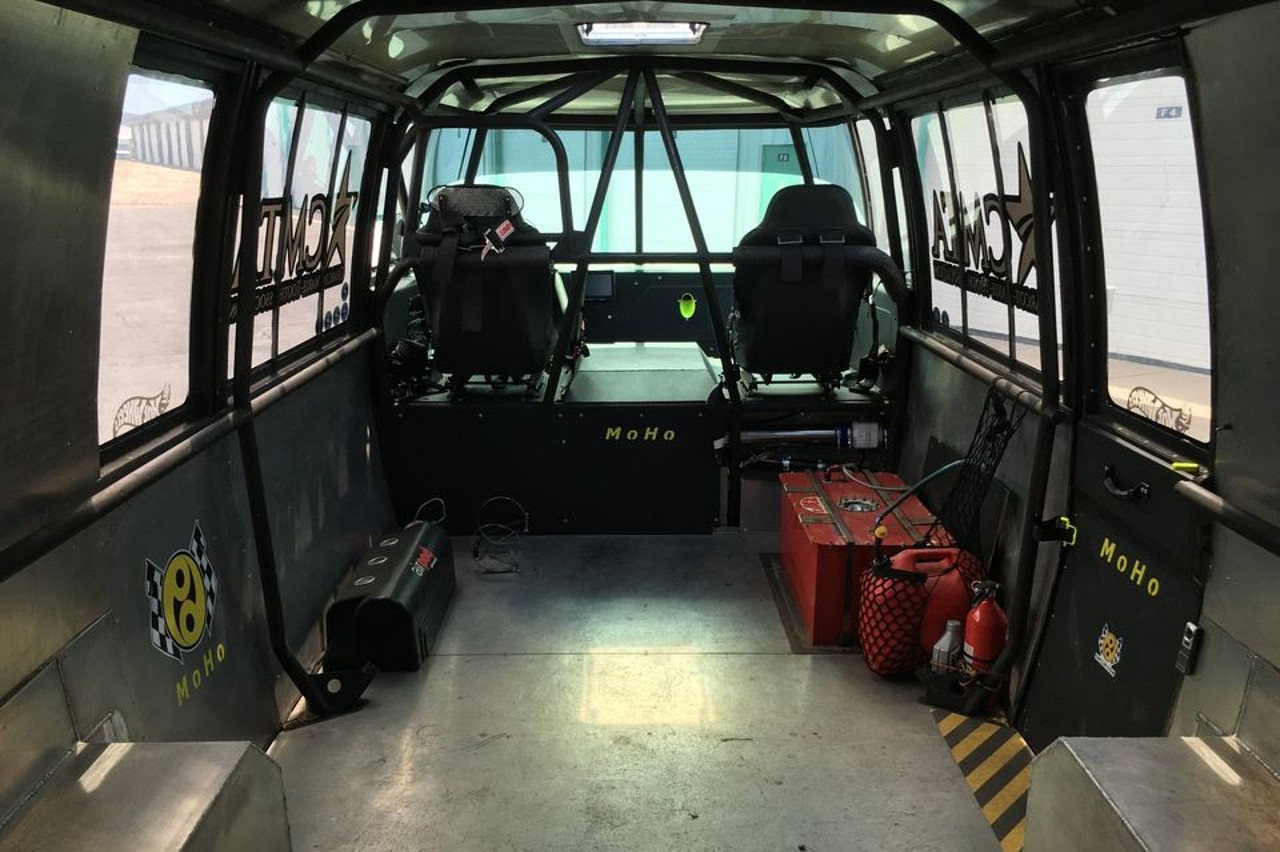 También montaron una cabina de conducción propia de un coche de carreras, provista de un tablero RacePak IQ3, un asiento de carreras Kirkey y una jaula antivuelco completa para proteger a los ocupantes en caso de accidente.