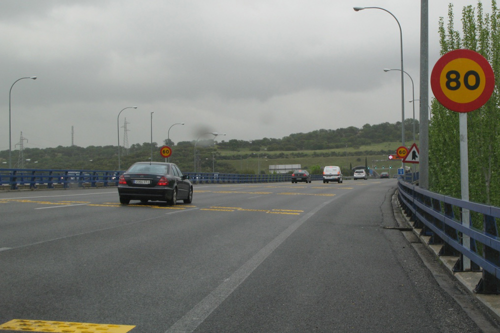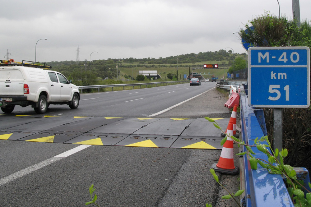 El resalto de la M-40 está colocado en el kilómetro 51 en sentido creciente, justo antes de pasar el último de los túneles del Pardo. Lo han instalado sobre una de las juntas de dilatación de un puente, lo que hace pensar que se trata de una solución provisional hasta que reparen una posible incidencia en la infraestructura, aunque el Ministerio de Fomento, responsable de esta carretera, no se ha pronunciado al respecto por el momento.