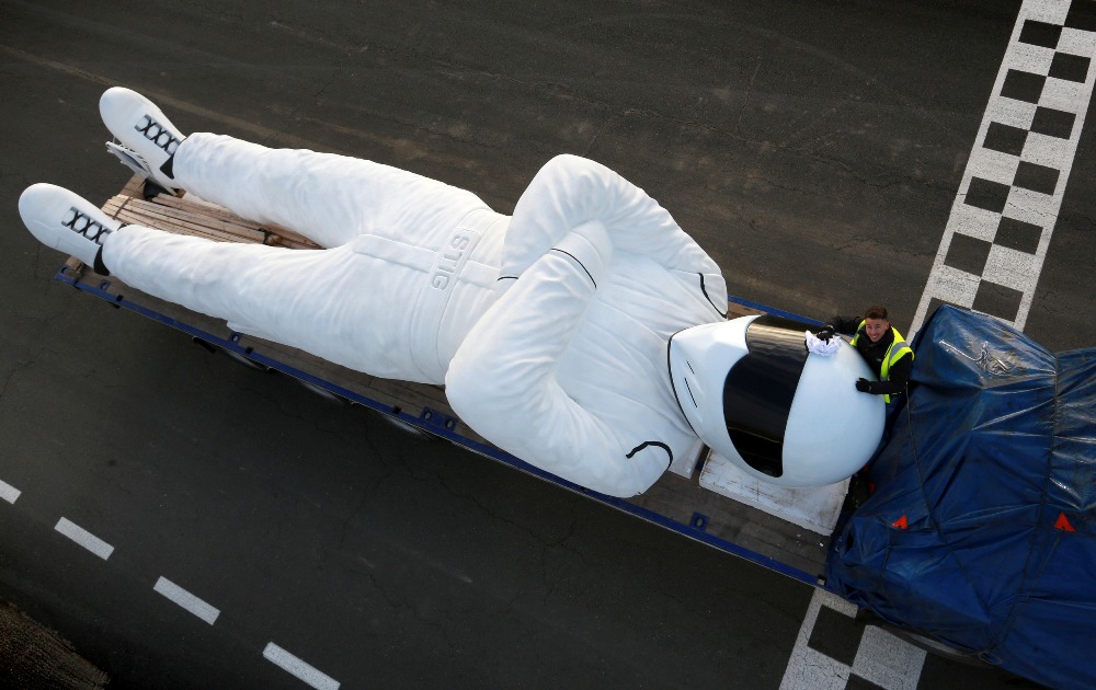 El Stig de nueve metros está fabricado en fibra de vidrio, y un equipo de tres escultores ha requerido de dos meses para diseñar, construir y pintar el enorme monumento. Para que se haga una idea del tamaño del Stig de fibra de vidrio, tan sólo la cabeza y el torso miden 3,6 metros, altura similar a la de los famosos autobuses londinenses de dos pisos. Para llegar a Varsovia, fueron necesarios tres días de viaje a bordo de un camión, partiendo desde el aeródromo Dunsfold en Surrey, sede de Top Gear, y pasando por Ámsterdam y Berlín.