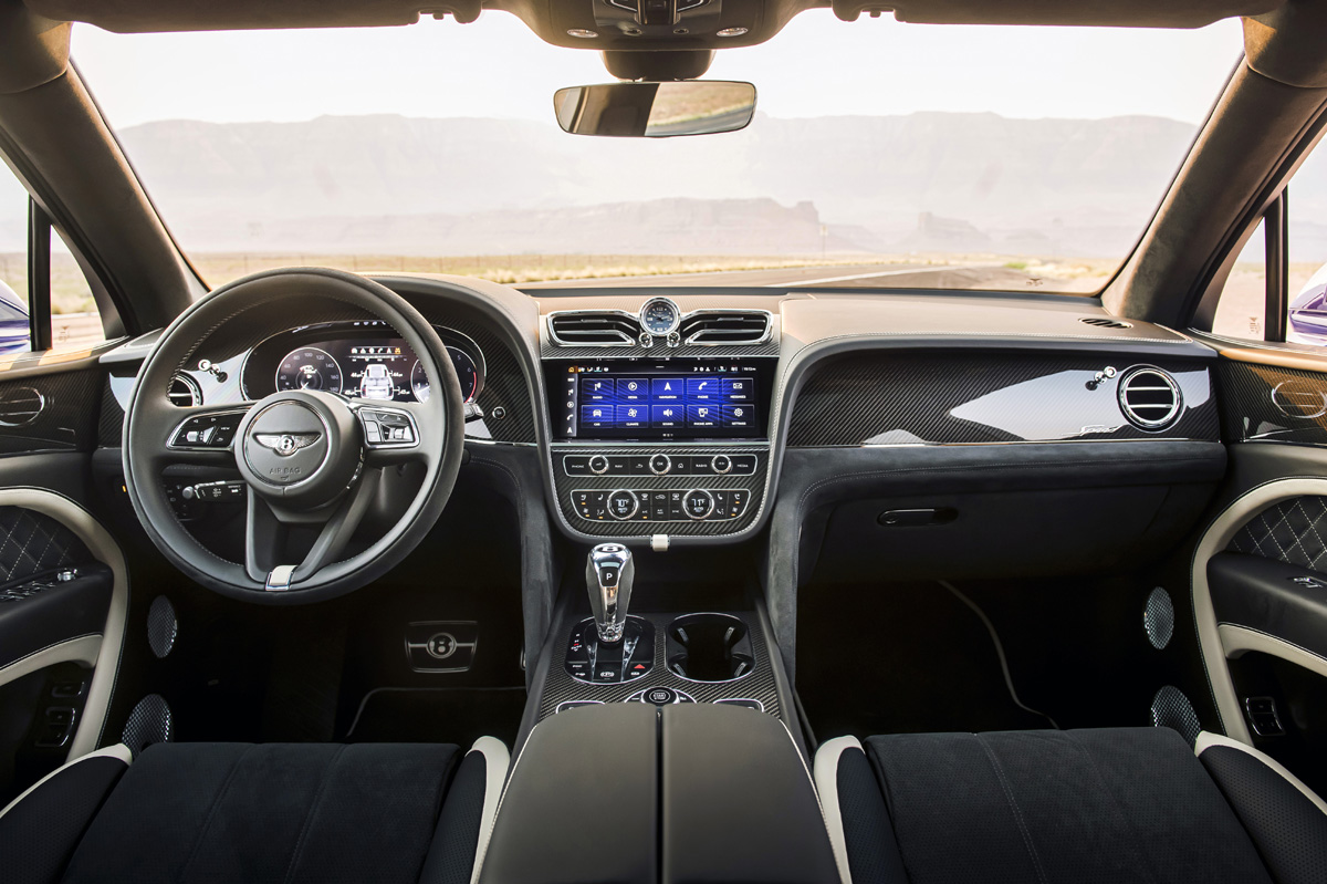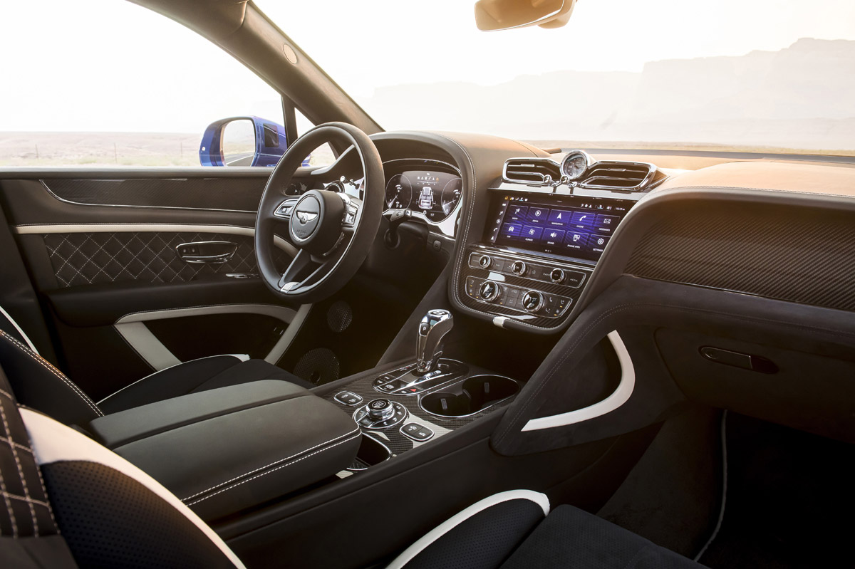 El Bentley Bentayga Speed 2021 luce en su lujoso habitáculo un nuevo volante, asientos, cuadro de mandos digital de 12,3 pulgadas, un Head-Up Display a color o una pantalla de 10,9” para el sistema de información y entretenimiento. En líneas generales, el interior del Speed presenta tonalidades más oscuras y por primera vez puede llevar elementos tapizados en Alcantara, como el guarnecido del techo, de los pilares o en el volante y la palanca de cambios.