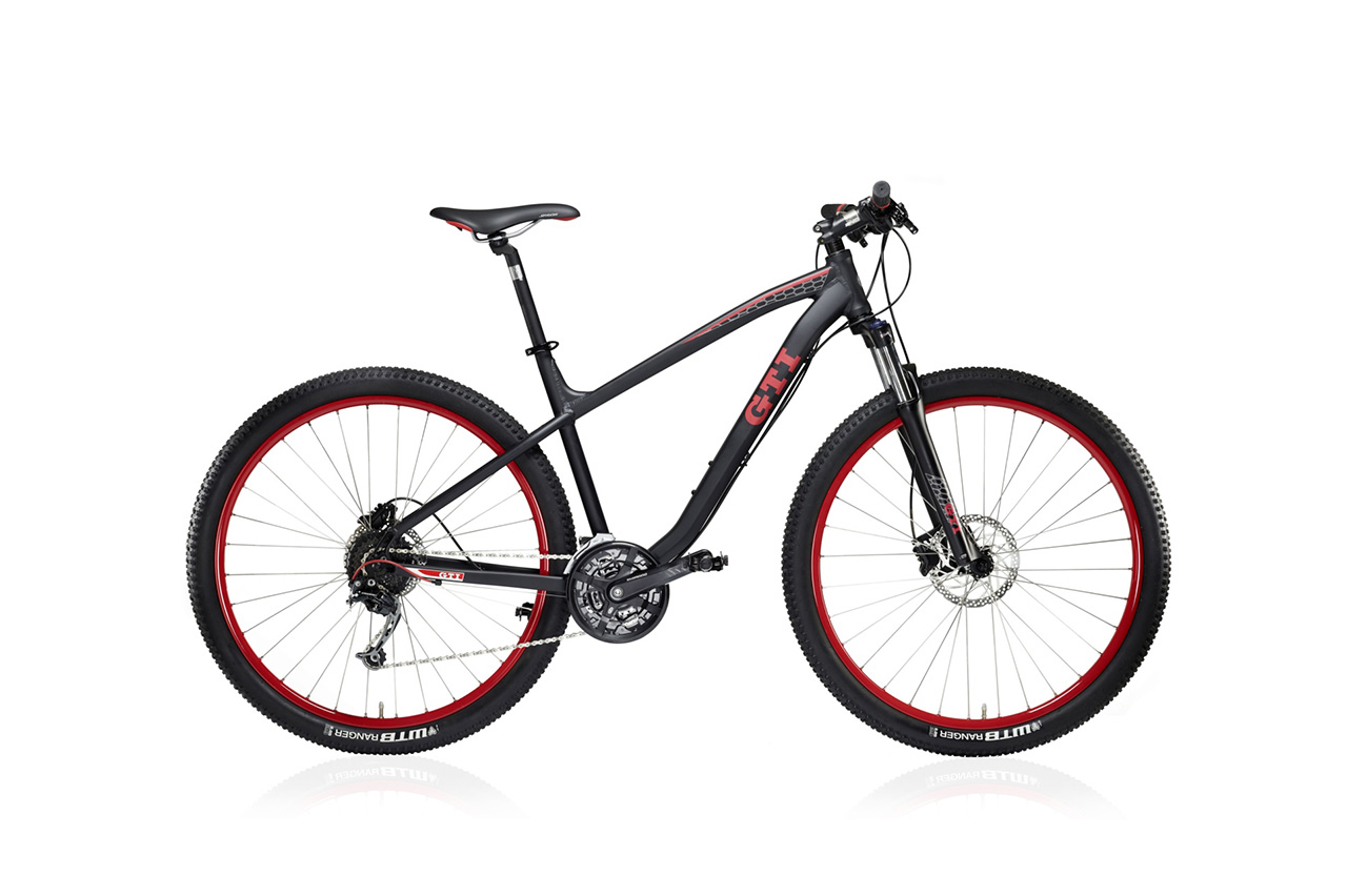 La bicicleta de montaña de 29 pulgadas de altura está terminada en negro mate y luce el logotipo GTI en el tubo inferior del cuadro y en la horquilla. Adicionalmente, encontrarás el emblema lateral GTI en el travesaño de la cadena, mientras que las llantas tienen el característico color rojo de GTI. Los manillares están diseñados en dos colores, rojo y negro.