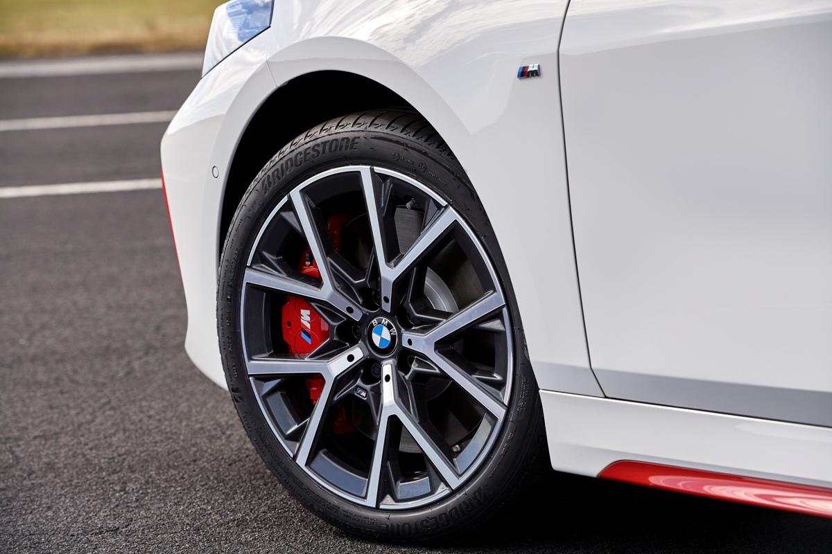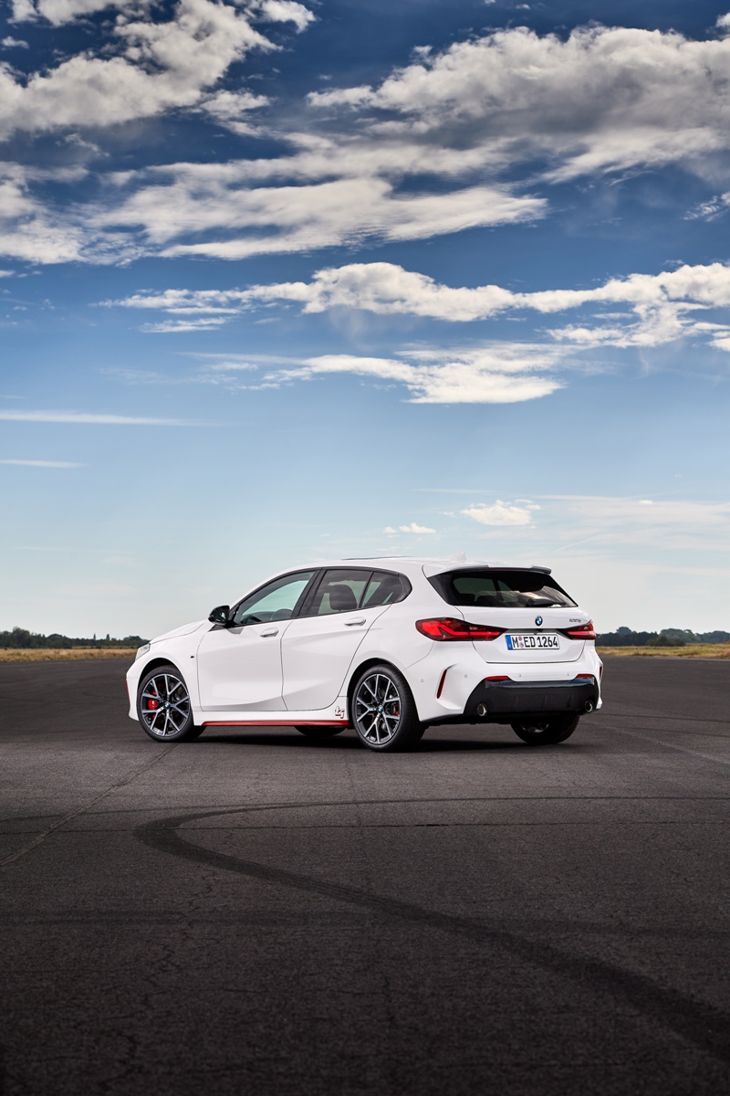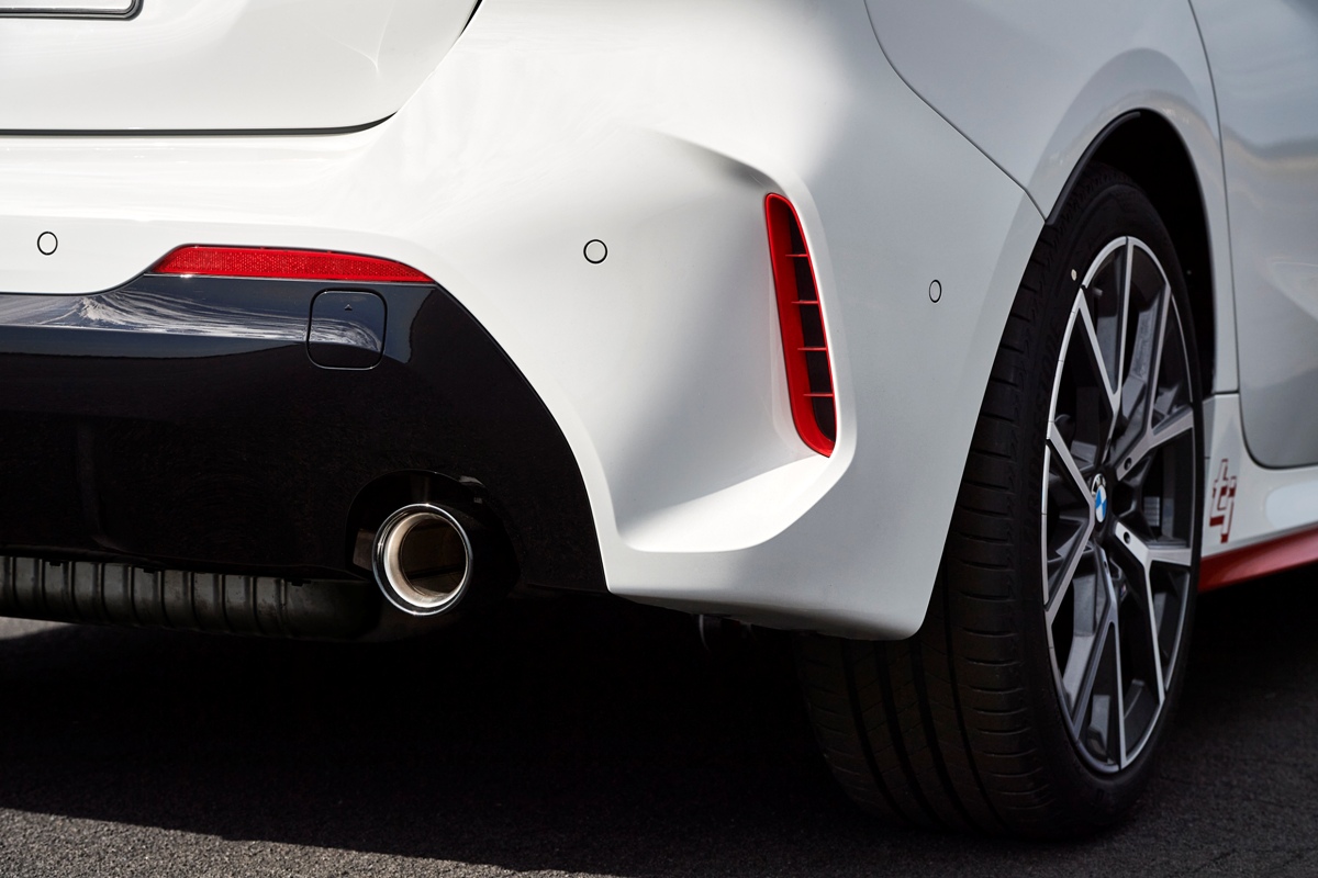 Desde el lateral se aprecian las nuevas taloneras con inserciones de color rojo y el logotipo “ti” impreso, así como un conjunto de llantas de aleación ligera 553 M de 18 pulgadas con radios en Y y un acabado bicolor, exclusivas del BMW 128ti 2021. Se pueden revestir con neumáticos Michelin Pilot Sport 4 de manera opcional y sin sobrecoste. Por último, al estar basado en el acabado M Sport, la zaga destaca por el alerón y el difusor con doble salida de escape. En el caso de especificar los colores exteriores Melbourne Red o Misano Blue, la insignia “ti” pasa a ser de color negro.