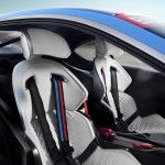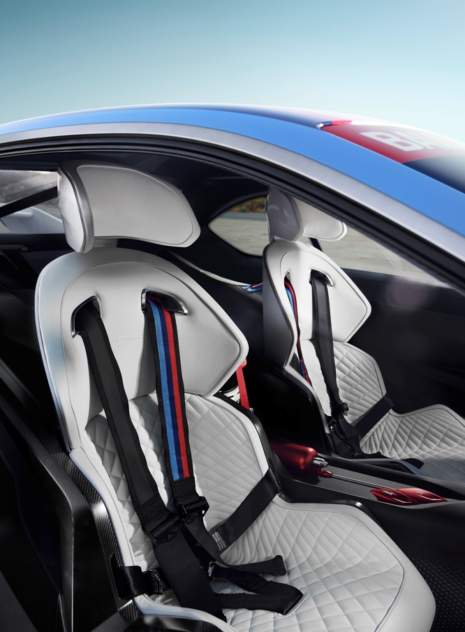 Las carcasas de los asientos, por su parte, siguen una trayectoria diagonal ascendente, una línea extendida detrás de los asientos en la parte trasera por un elemento de fibra de carbono estructural que aumenta la rigidez torsional del BMW 3.0 CSL Hommage R. La tapicería acolchada de color blanco imita el traje del piloto, mientras que las famosas líneas de BMW Motorsport representadas en los cinturones de seguridad con arnés de seis puntos de anclaje otorgan una nota de color al interior.