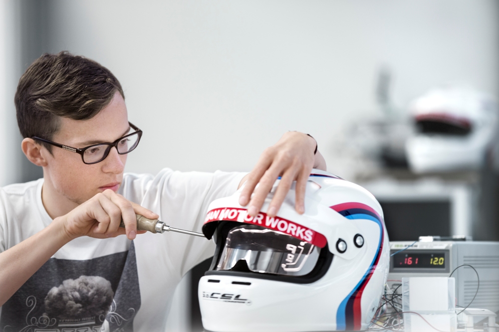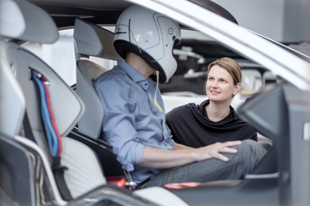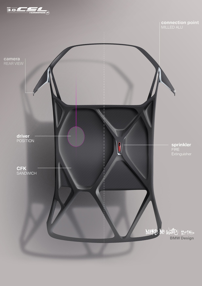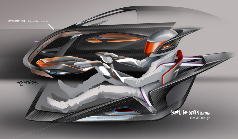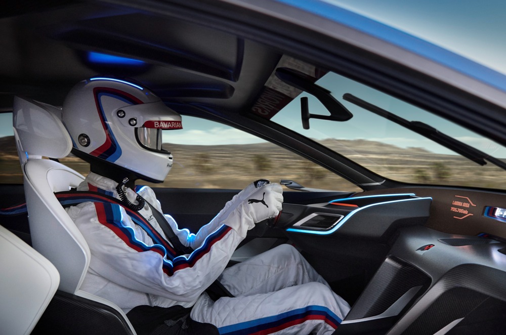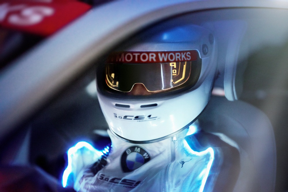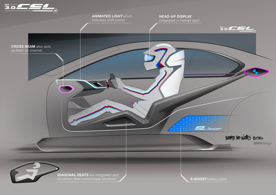 Dando el salto al habitáculo, el BMW 3.0 CSL Hommage R está totalmente enfocado en el conductor, habiendo los diseñadores incluso creado un traje de competición enfocado a ello antes de crear el resto del habitáculo. La visera del casco asume las funciones de pantalla y proyecta información sobre la velocidad, la marcha engranada y las rpm del motor. Sin duda, una interesante reinterpretación de los sistemas Head-Up Display.