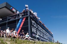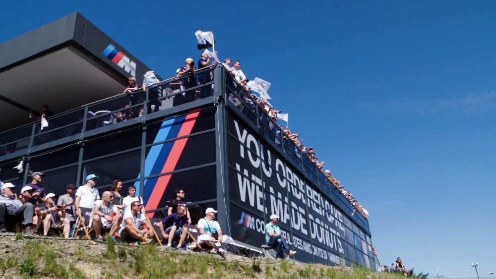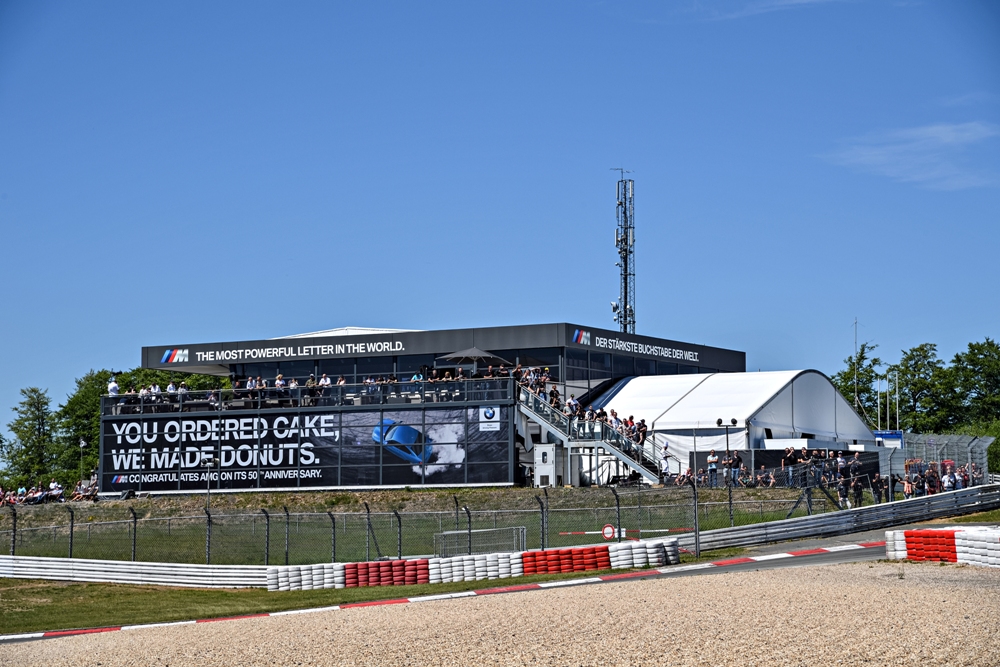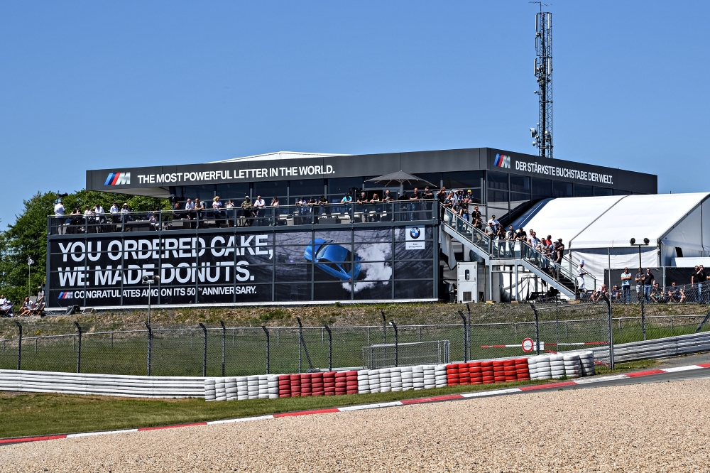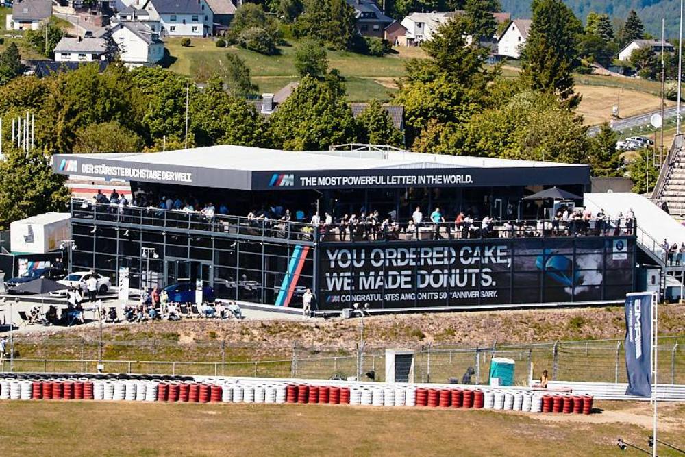 La valla estaba situada en una localidad específicamente reservada para BMW y en ella podemos ver lo que parece ser un BMW M2 (prueba) terminado en azul Long Beach mientras quema sus neumáticos traseros al más puro estilo M. Acompañando la imagen podemos leer: “Vosotros encargasteis tarta, nosotros hicimos donuts. M felicita a AMG en su 50º aniversario”.
