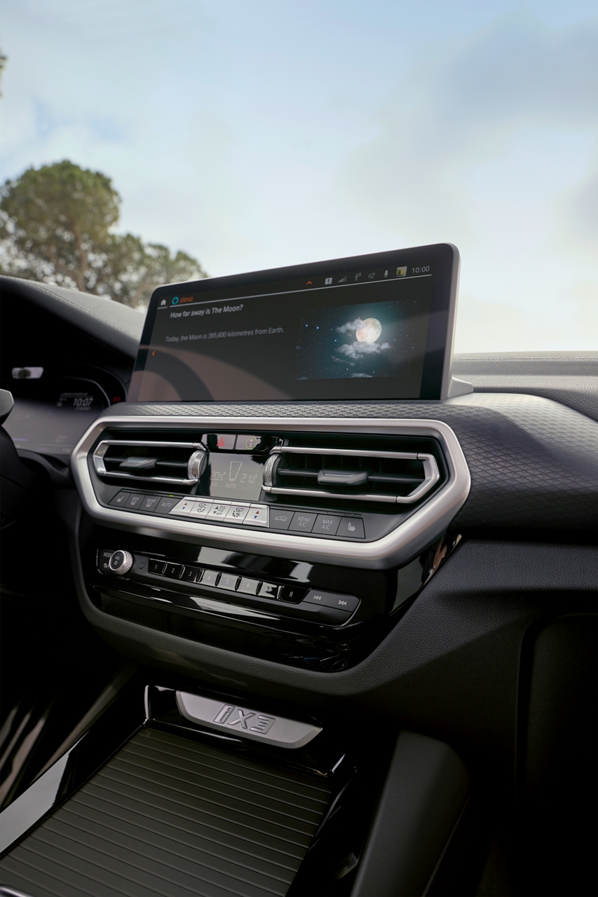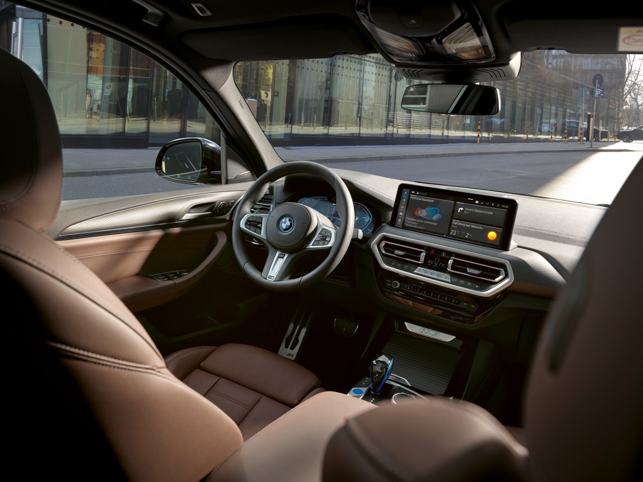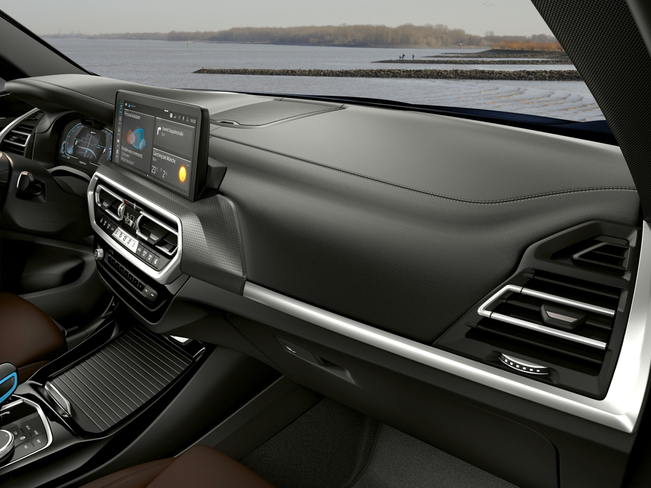 La cabina del iX3 también recibe algunos cambios importantes. Los compradores encontrarán un cuadro de instrumentos digital de 12,3 pulgadas y un sistema multimedia con una pantalla más grande que alcanza las 12,3 pulgadas. A esto se suman nuevos interruptores, una consola central actualizada y un control para la transmisión. Molduras de aluminio en acabado oscuro o nuevos asientos deportivos de serie con tapicería Sensatec forman parte del equipamiento de serie.