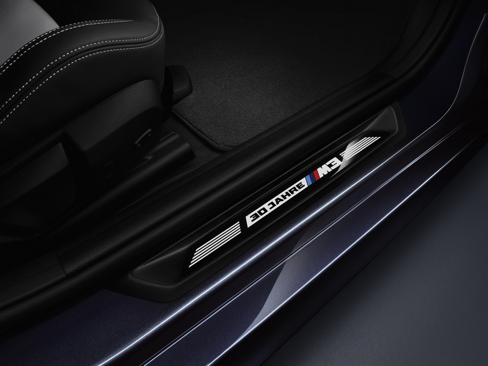 En el habitáculo del BMW M3 ‘30 Years M3’ nos encontramos con una cuidada tapicería de cuero Merino disponible en dos colores diferentes, con unos asientos deportivos aligerados, con apliques decorativos realizados con fibra de carbono o con unos protectores en los umbrales de las puertas con una inscripción.