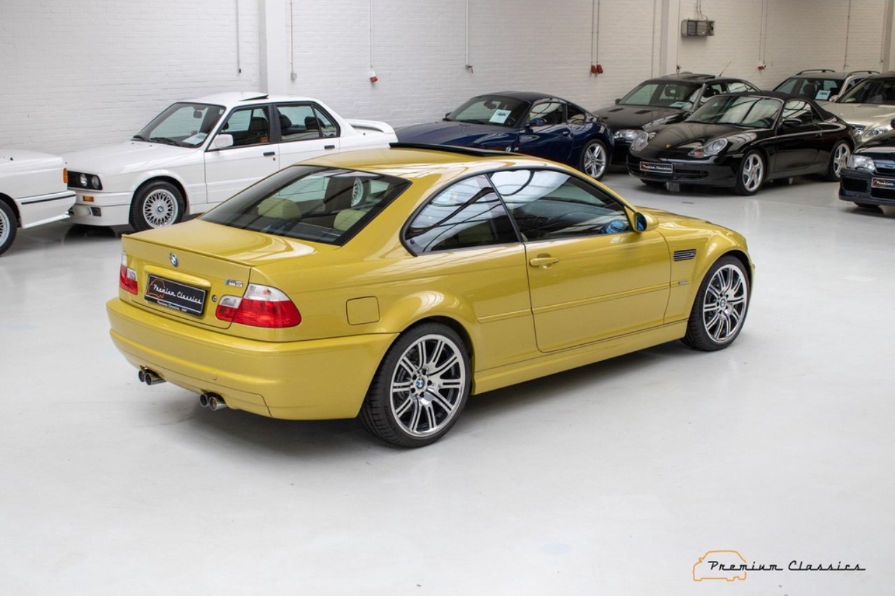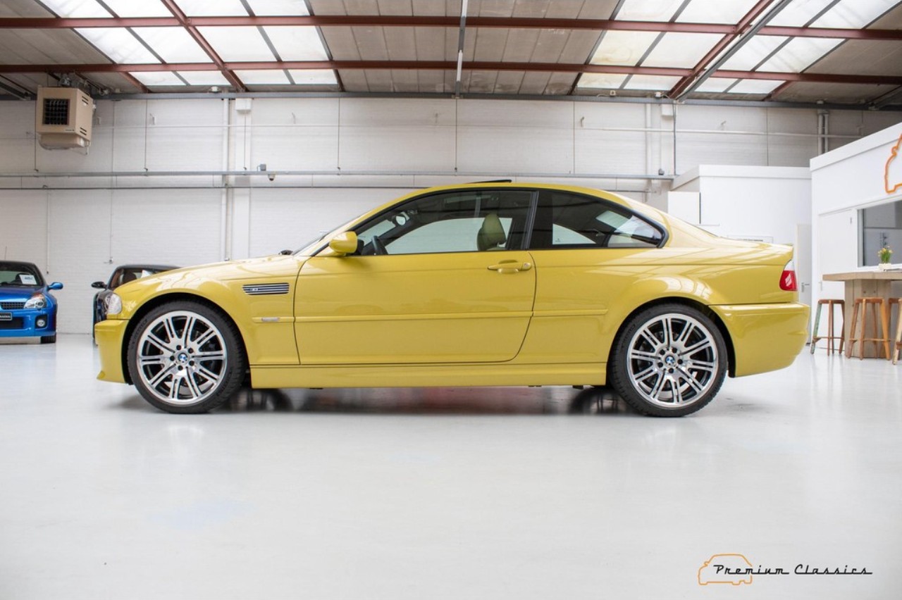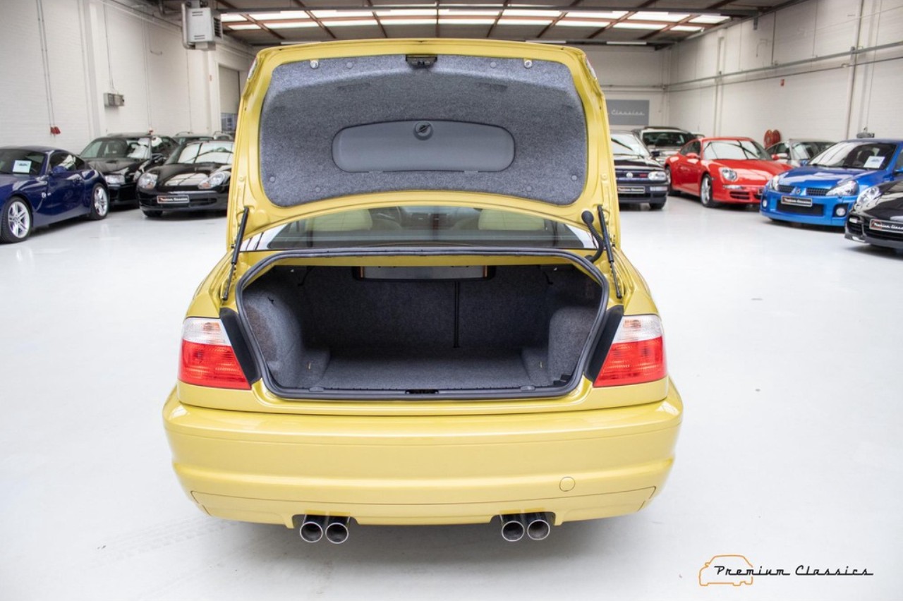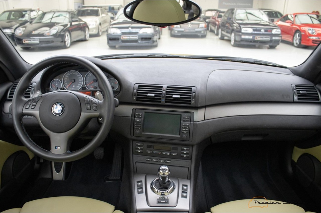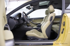 Terminado en una llamativa pintura de color amarillo metalizado, este M3 E46 reposa sobre unas llantas originales M de 18 pulgadas. El interior combina con el exterior con una curiosa tapicería de cuero en un tono de beige a juego con elementos en negro y gris presentes en las puertas, el salpicadero y la consola central. Dado el estado de conservación, no se aprecian signos de desgaste aparentes en el volante o los asientos delanteros.