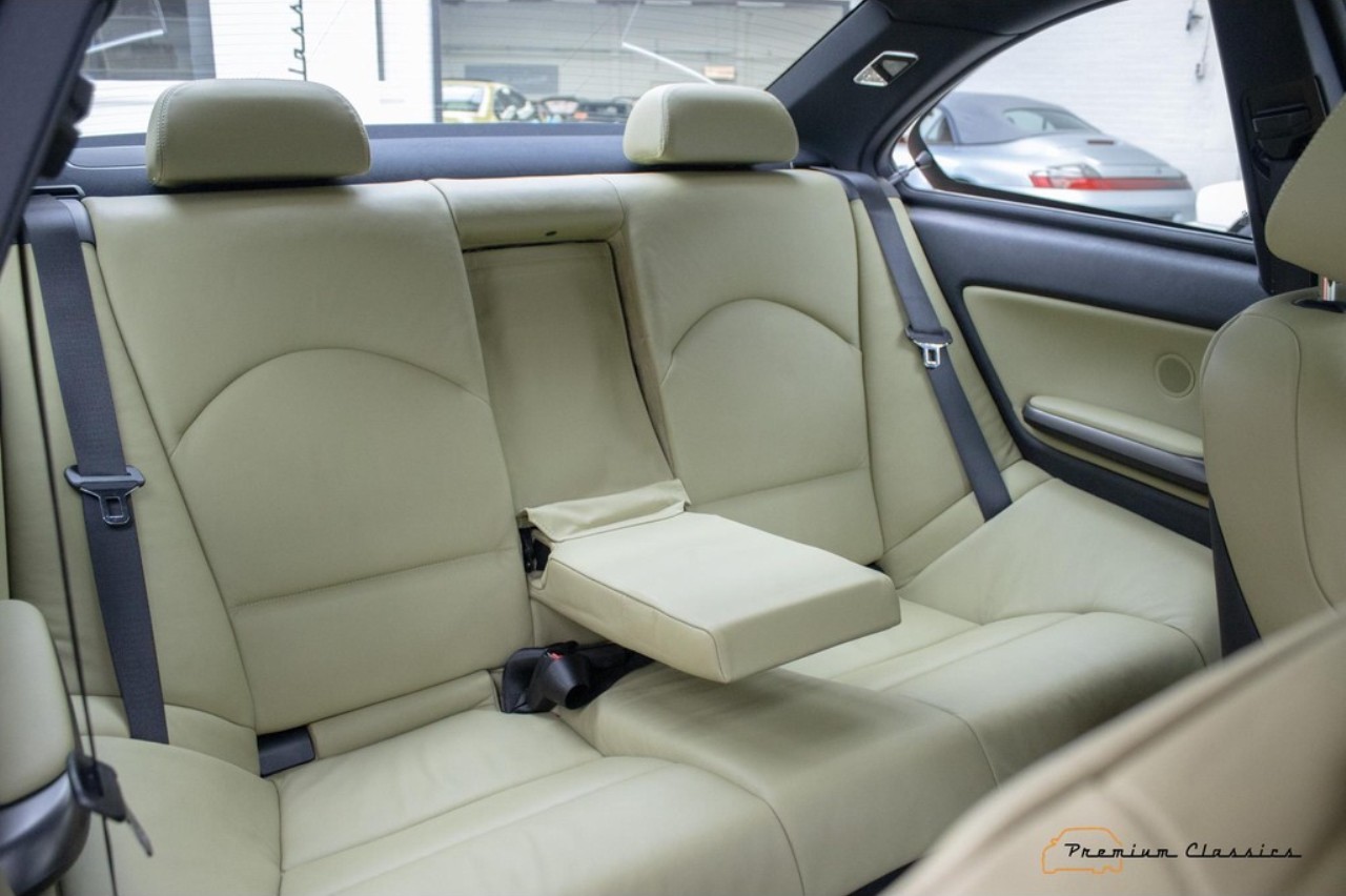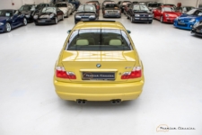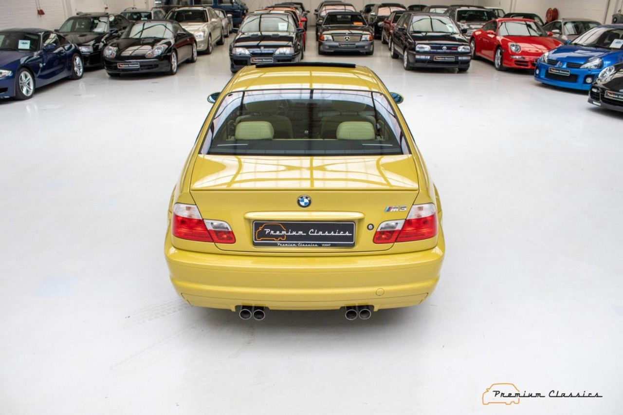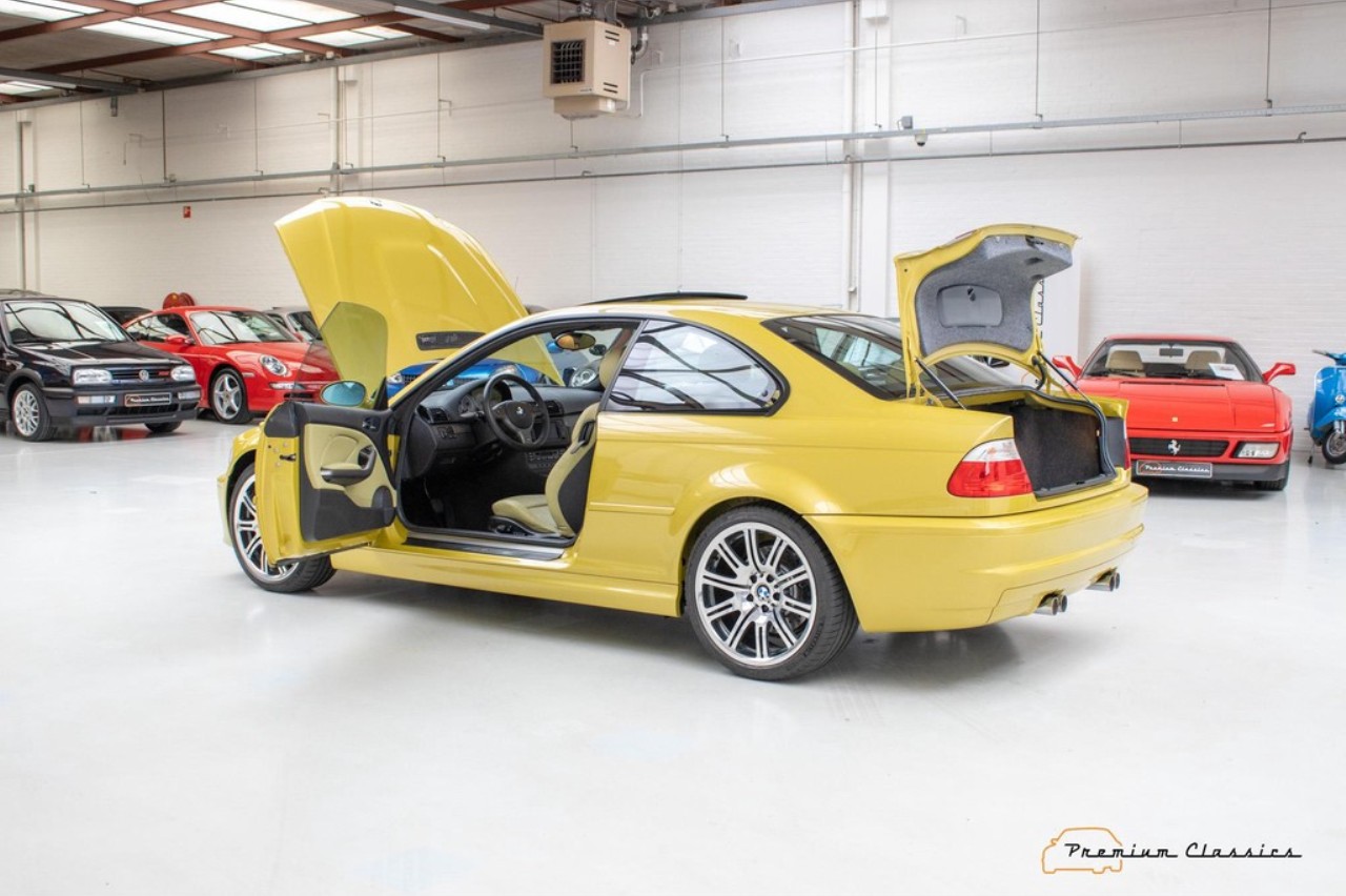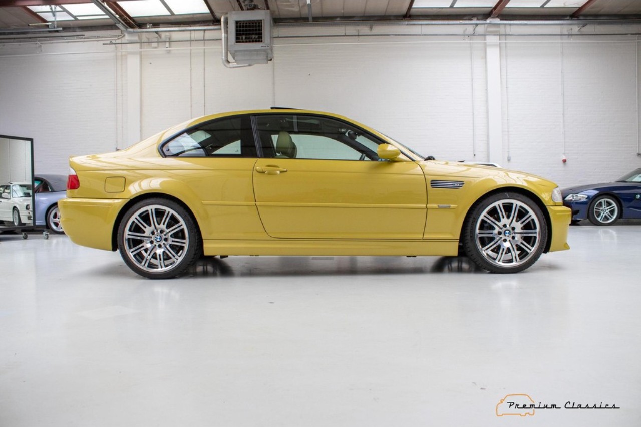 Terminado en una llamativa pintura de color amarillo metalizado, este M3 E46 reposa sobre unas llantas originales M de 18 pulgadas. El interior combina con el exterior con una curiosa tapicería de cuero en un tono de beige a juego con elementos en negro y gris presentes en las puertas, el salpicadero y la consola central. Dado el estado de conservación, no se aprecian signos de desgaste aparentes en el volante o los asientos delanteros.