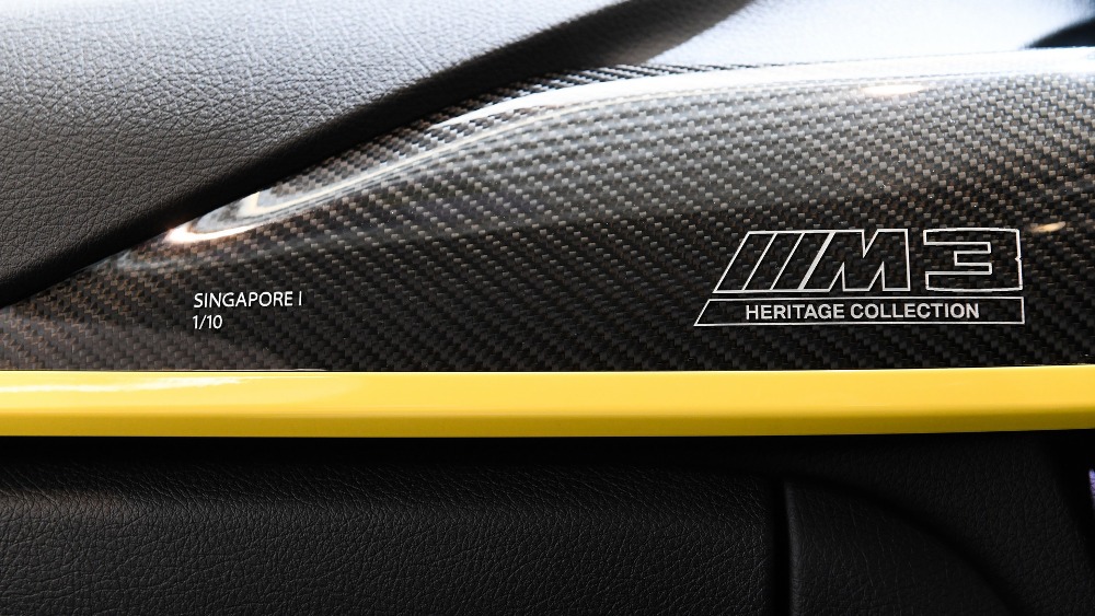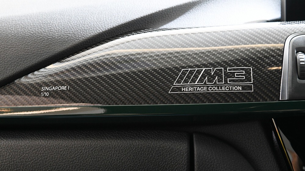 En el exterior del denominado BMW M3 Heritage Collection Singapur Edition I, el modelo de edición limitada ofrece las llantas de aleación M de 20 pulgadas, un acabado negro cromado para las salidas de escape y unas inserciones en negro Shadow Line del catálogo BMW Individual. Una vez en la cabina, además de los asientos específicos de corte deportivo, también encontramos un grabado al láser sobre la fibra de carbono del salpicadero que identifica el número de la edición limitada.