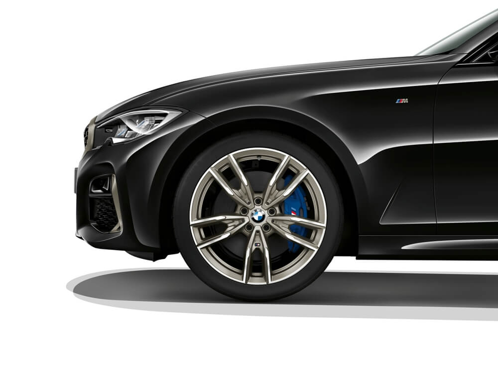 Para un comportamiento dinámico, el BMW M340i xDrive 2019 dispone de una suspensión M Sport con una configuración activa disponible con nuevos amortiguadores ajustables, un diferencial deportivo controlado electrónicamente, una dirección variable y un sistema de frenos mejorados con discos de 348 mm en el tren delantero y de 345 mm en el tren posterior, con pinzas de cuatro y dos pistones, respectivamente.
