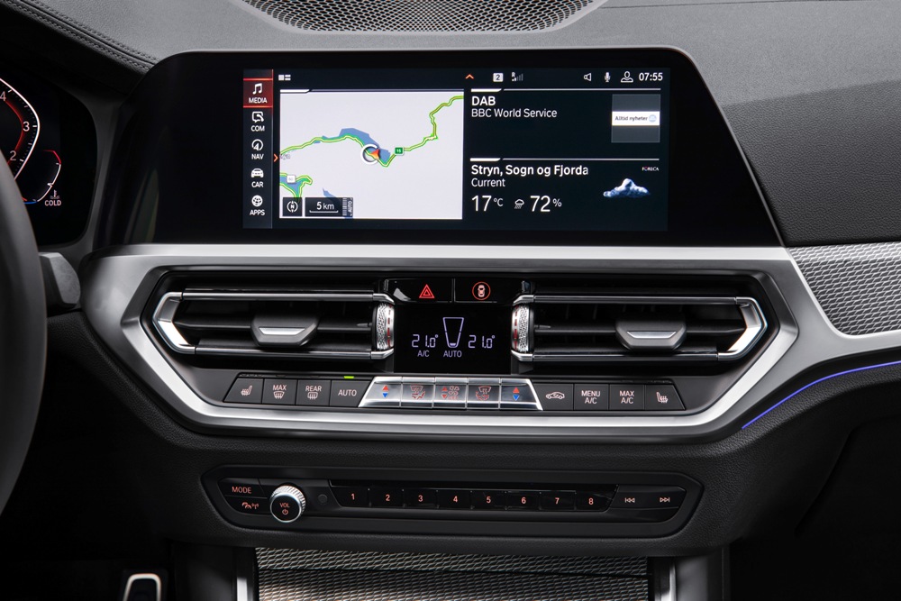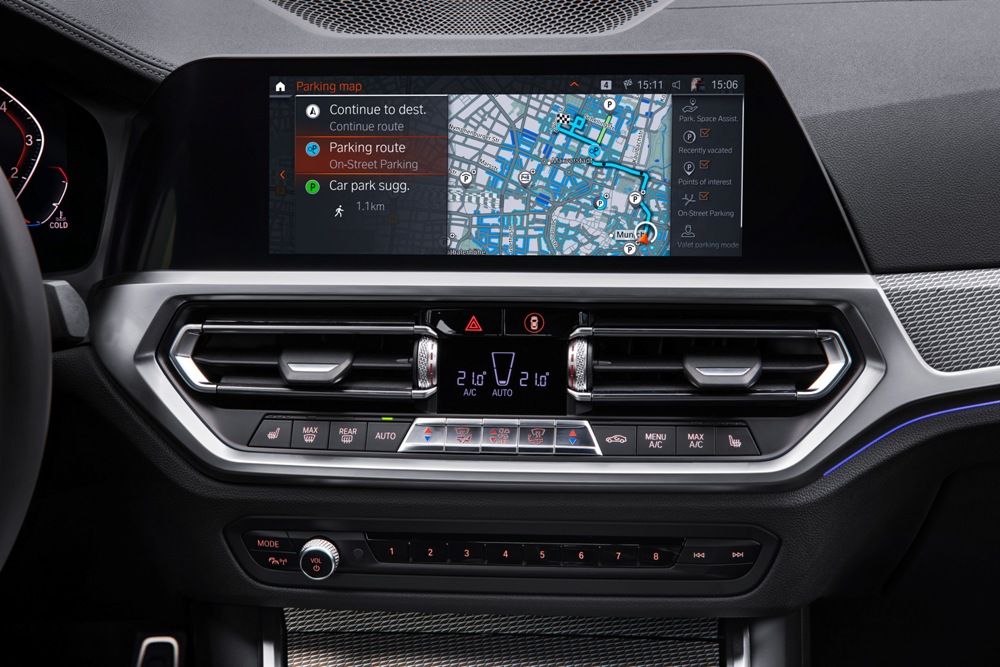 El nuevo Serie 3 está disponible con acabados Sport, Luxury y M Sport, y ofrece tapicerías opcionales de cuero Vernasca y BMW Individual Merino. Otros elementos destacados incluyen el climatizador de tres zonas, la calefacción auxiliar, el cargador inalámbrico para smartphones, el parabrisas con vidrio acústico y el sistema de iluminación ambiental junto al equipo de sonido envolvente Harman Kardon.