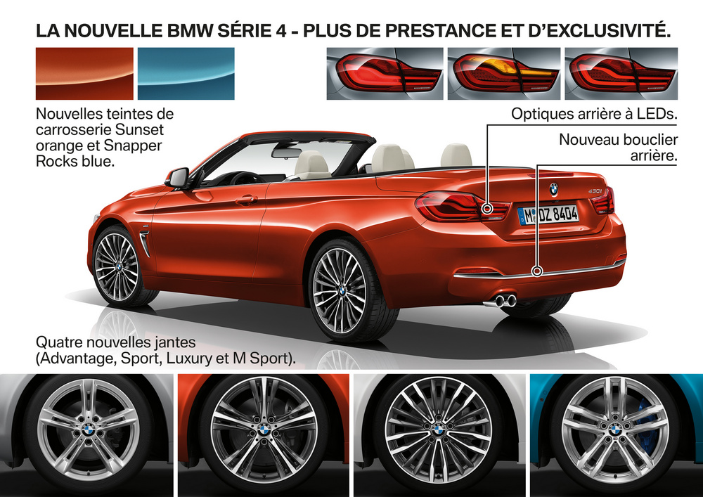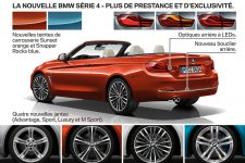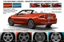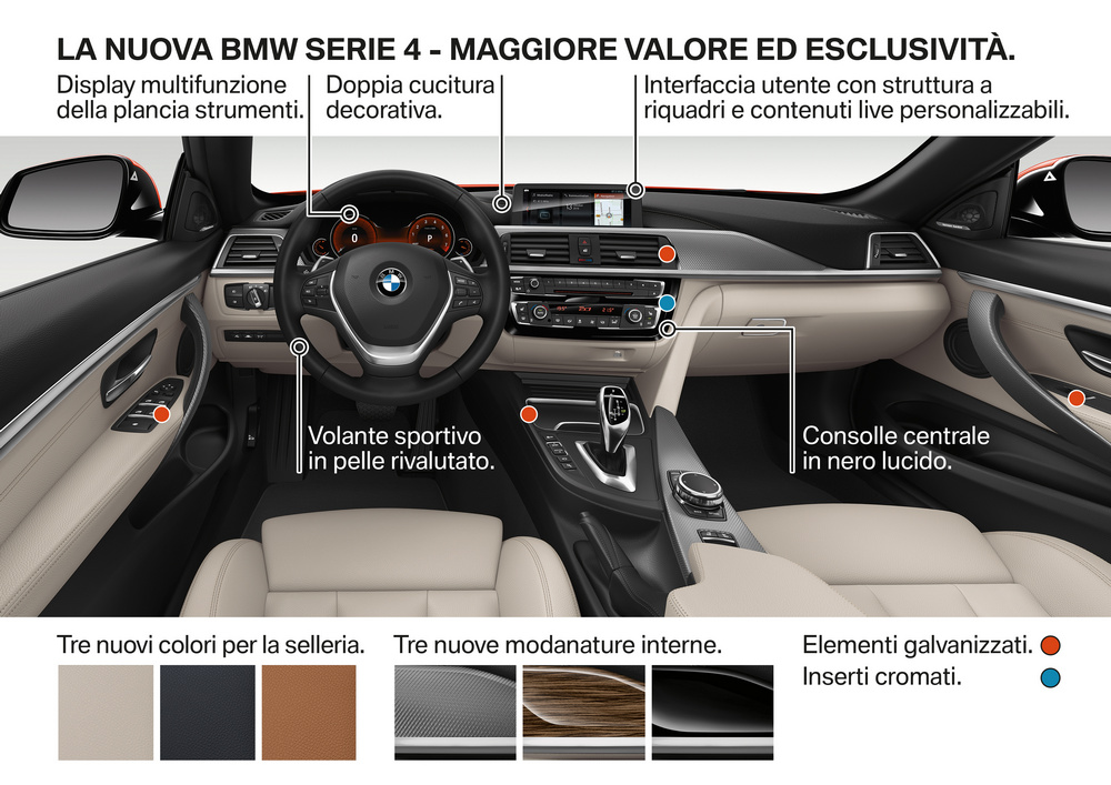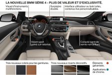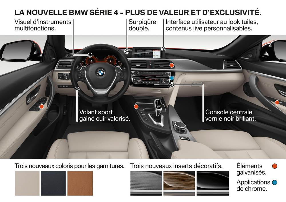 Los cambios a nivel de equipamiento del nuevo BMW Serie 4 afectan principalmente al sistema de navegación opcional Professional, que según indica la firma, llega con un interfaz con controles basados en las series más altas de la marca, y al cuadro de mandos, que en opción puede ser multifuncional dando opción a elegir entre varias posibilidades de visualización. En cuanto al comportamiento, los cambios vienen de la mano de una suspensión más enérgica (para los Serie 4 Coupé 2017 y Serie 4 Grand Coupé  2017), tanto en la configuración estándar como con la suspensión M Sport o la adaptativa opcional.