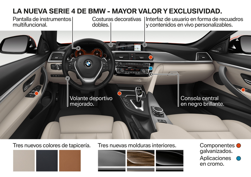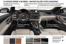 En el habitáculo, tanto el Serie 4 Coupé 2017 como su ‘hermanos’, los Serie 4 Grand Coupé 2017 y Serie 4 Cabrio 2017, lucen unos apliques decorativos en la consola central que ahora están acabados en color negro con brillo intenso en lugar de en cromo. En esta misma zona, en el salpicadero, destaca la presencia de una costura doble que recorre el panel de instrumentos, mientras que las novedades se completan con nuevos colores para la tapicería, tres en total, que se suman a las tres molduras decorativas que no estaban disponibles hasta ahora.