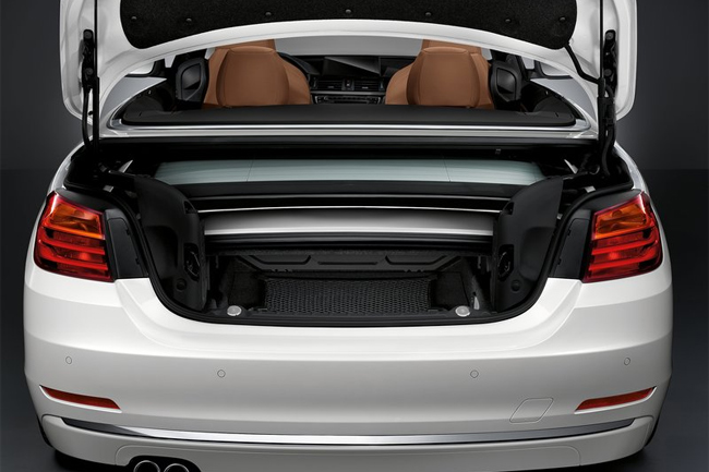 El techo metálico de tres segmentos se abre en 20 segundos y es posible accionarlo en marcha, siempre y cuando no se superen los 18 km/h. Además, equipa un sistema de aislamiento acústico mejorado mediante un guarnecido capaz de absorber ondas de sonido. Cuando el techo del Serie 4 Cabrio está cerrado, es posible transportar objetos de mayor tamaño, aprovechando el volumen total de 370 litros del maletero. Este volumen significa un aumento de 20 litros en comparación con el maletero del modelo antecesor. Si el techo está abierto y oculto debajo de la tapa posterior, puede utilizarse un sistema auxiliar de elevación para elevar su estructura completa, con lo que se puede acceder más fácilmente al compartimiento del maletero.