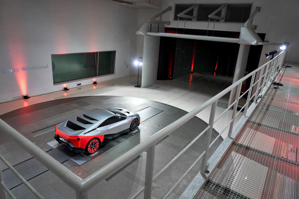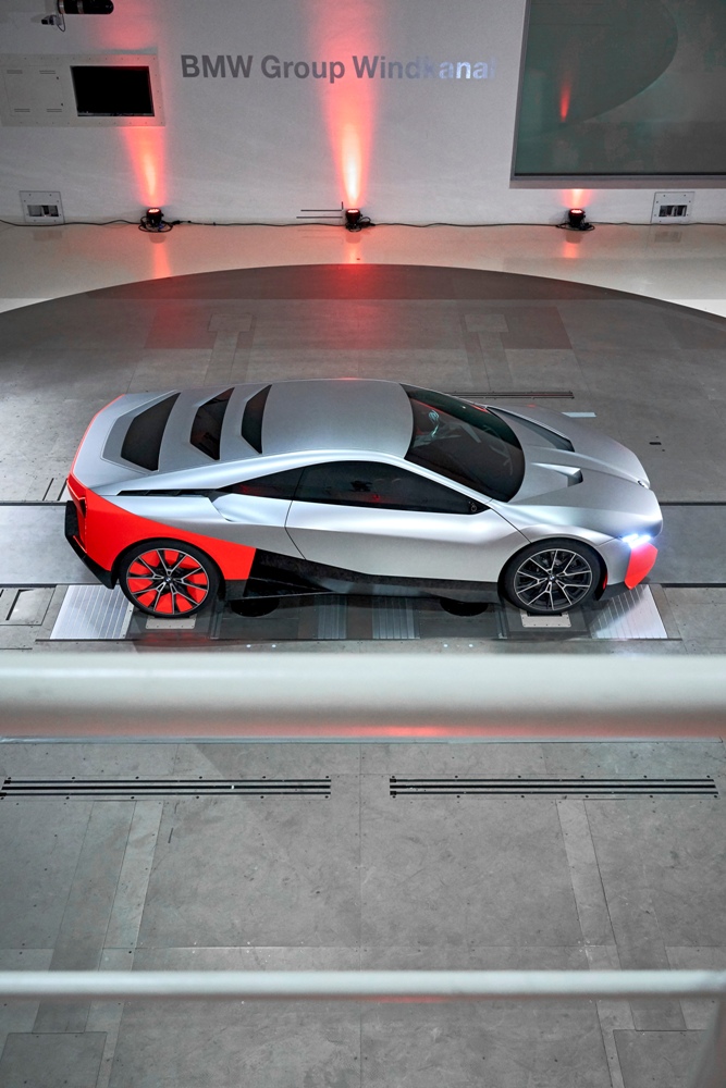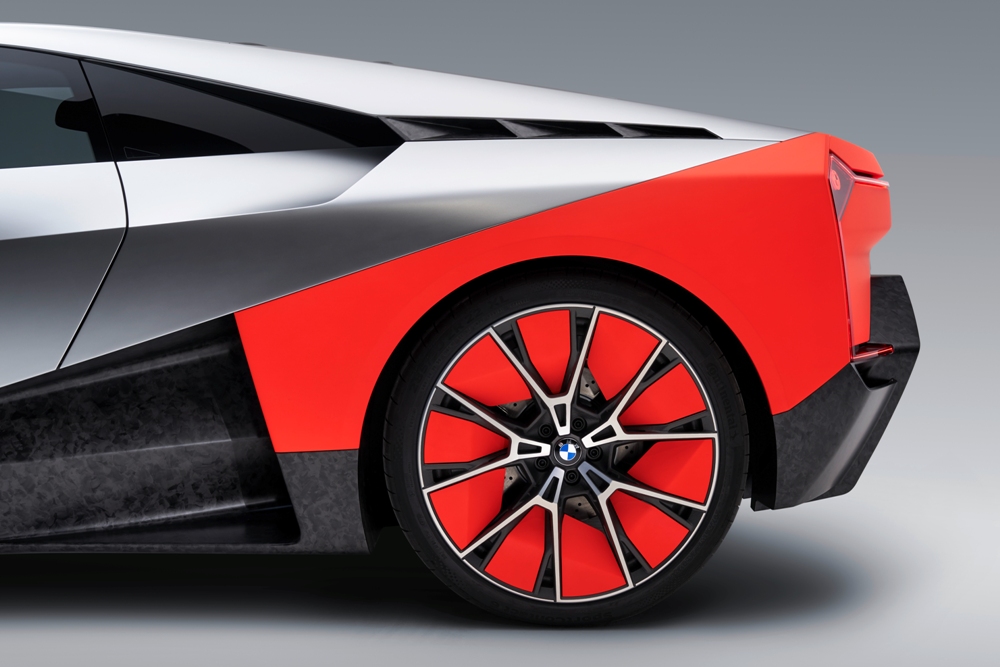 La imagen exterior recuerda poderosamente a la del BMW i8 (prueba). El frontal está protagonizado por una visión futurista de la característica parrilla de doble riñón, un parachoques en color Thrilling Orange de formas angulosas y un pequeño cuadro óptico de LED. El capó presenta dos aberturas en la sección posterior para mejorar el flujo de aire, mientras que la vista lateral nos deja la silueta de un deportivo coupé.