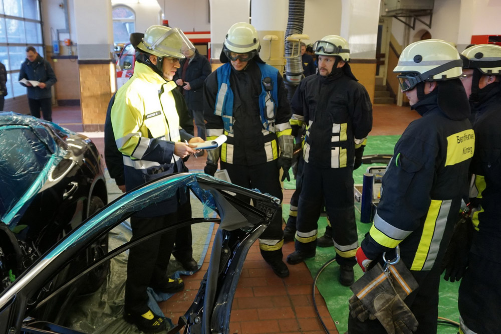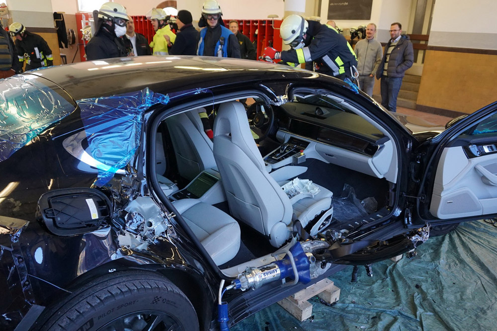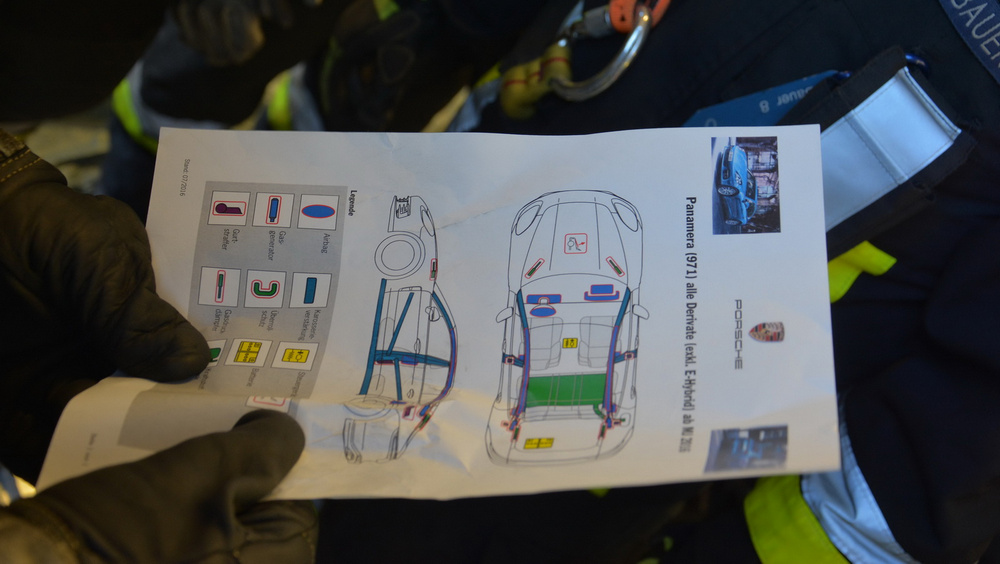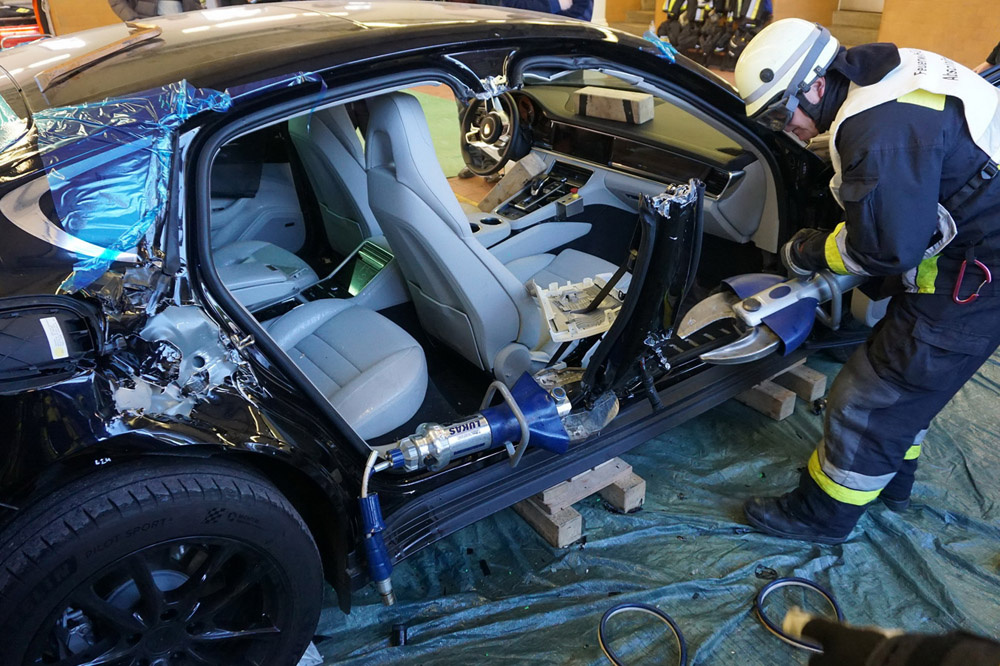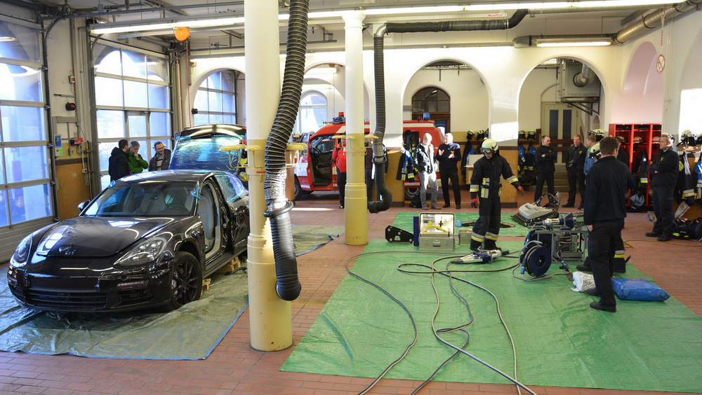 Bomberos alemanes entrenan cortando un nuevo Porsche Panamera