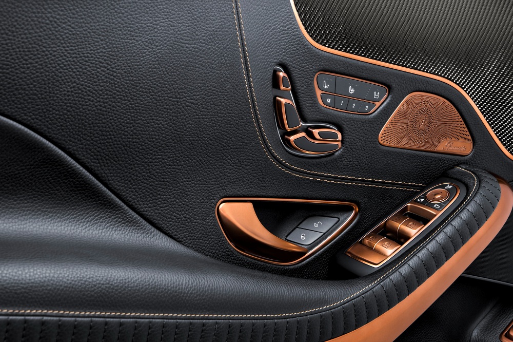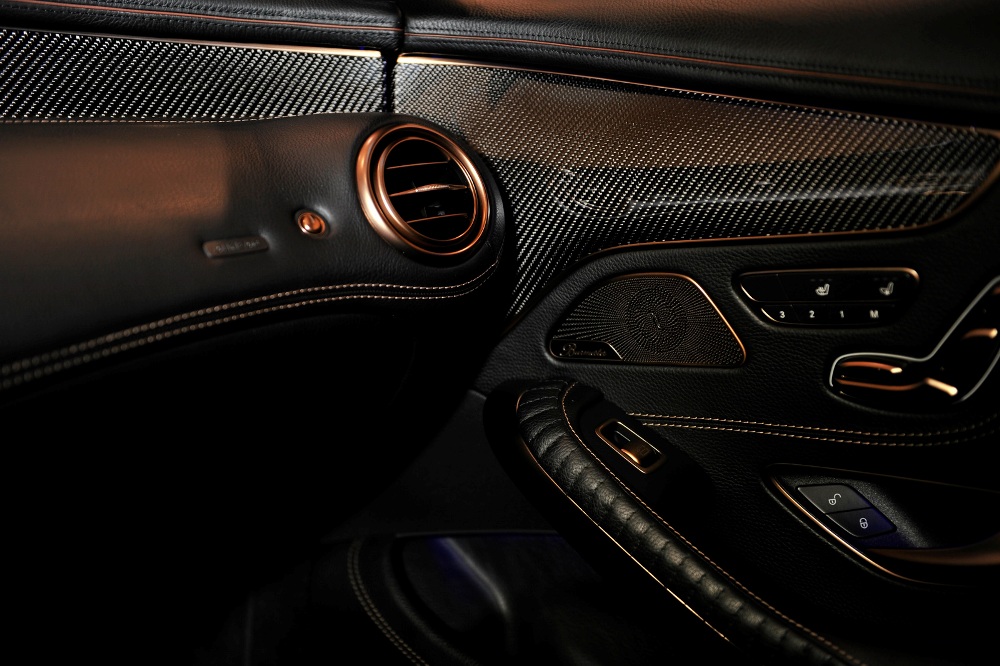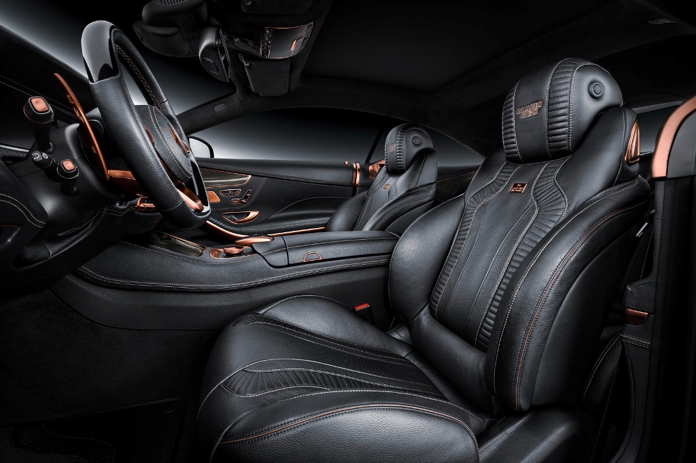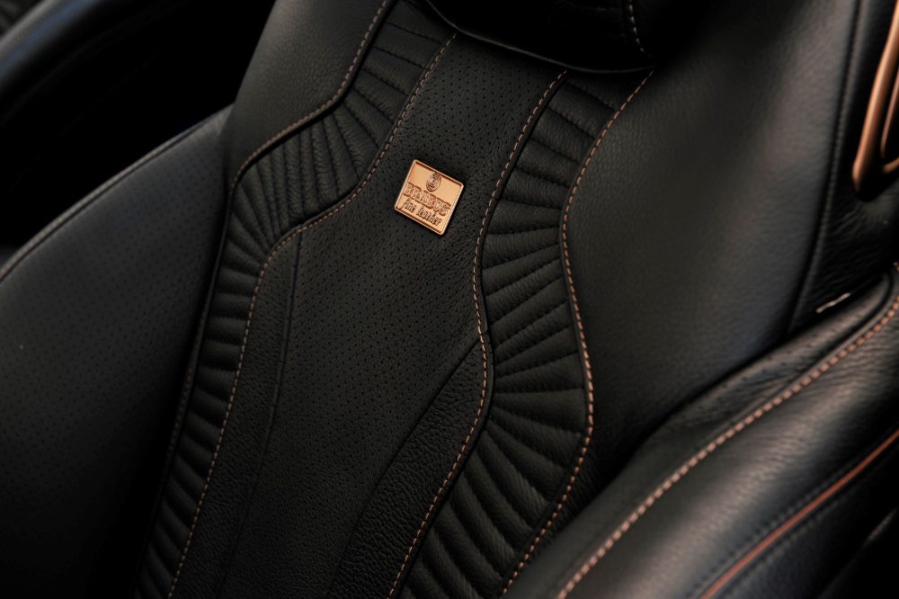 En el interior del Brabus 850 6.0 Biturbo Coupé, los asientos y el revestimiento de las puertas están terminadas en cuero negro Mastik, otorgando el contraste perfecto las 219 piezas individuales acabadas en color oro y cobre. Otros detalles, como la parte más elevada del salpicadero o la guantera central, están rematados en fibra de carbono y, para crear el ambiente ideal de lujo, confort y deportividad, la luz ambiental interior se puede ajustar en diferentes tonalidades.