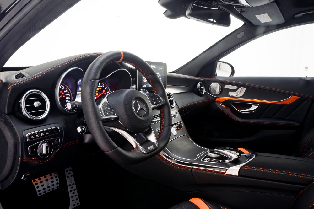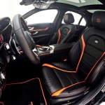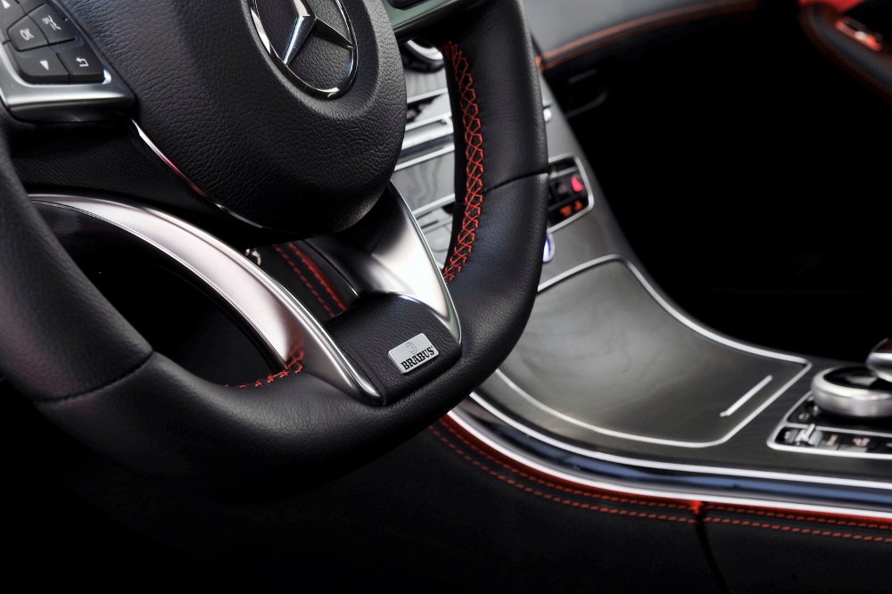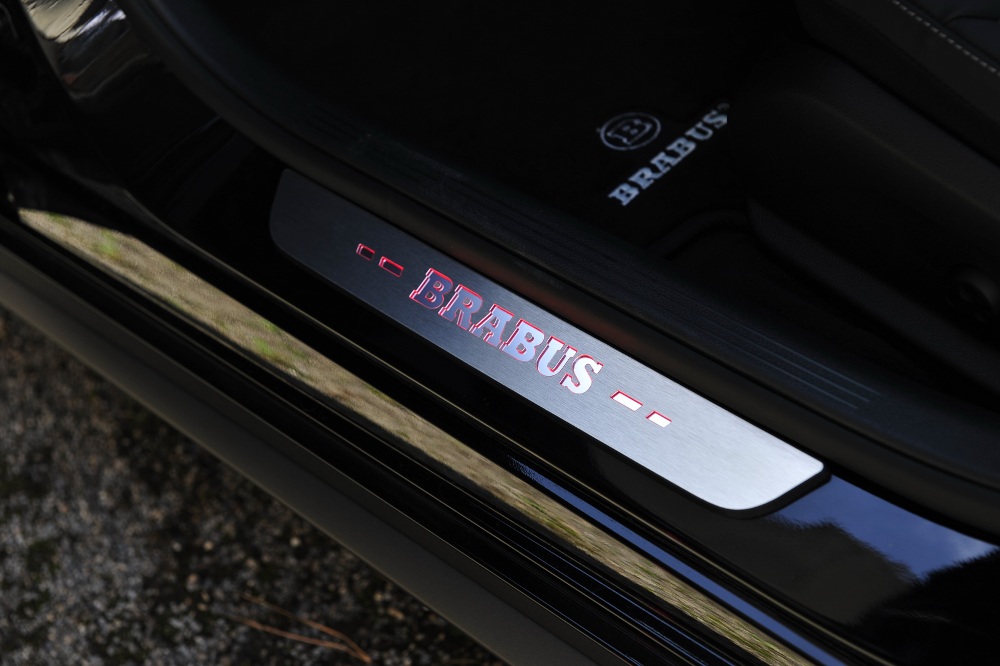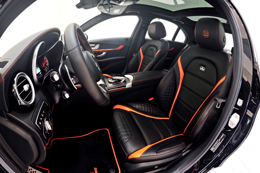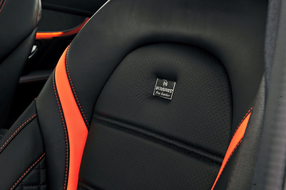 La cabina no se escapa a las manos de Brabus y recibe un buen tratamiento de personalización, donde ahora presenta levas para el cambio en aluminio, pedales y embellecedor del paso de puerta en acero y retroiluminado, marcador retocado para que indique 340 km/h y tapicería de cuero negro con costuras en naranja intenso, así como las alfombrillas y las inserciones en los asientos y los paneles de las puertas.