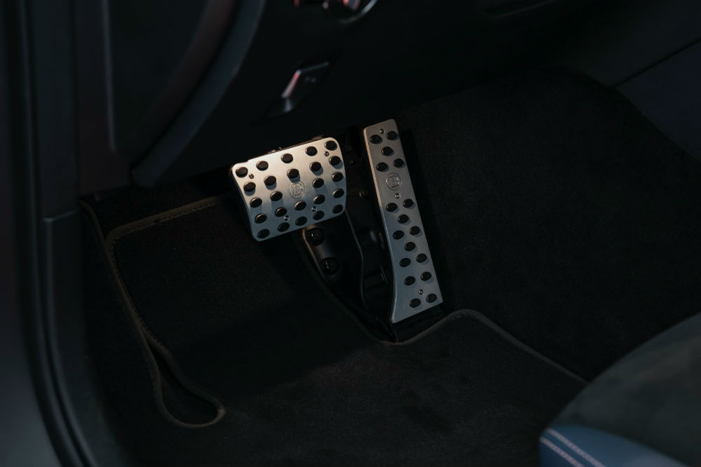 En el habitáculo Brabus ha optado por el cuero para forrar los paneles de las puertas y el salpicadero, lo combina con Alcantara para los asientos, los pedales son de aluminio, los umbrales de las puertas están retroiluminados y hasta los seguros están personalizados.