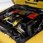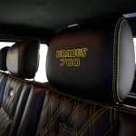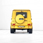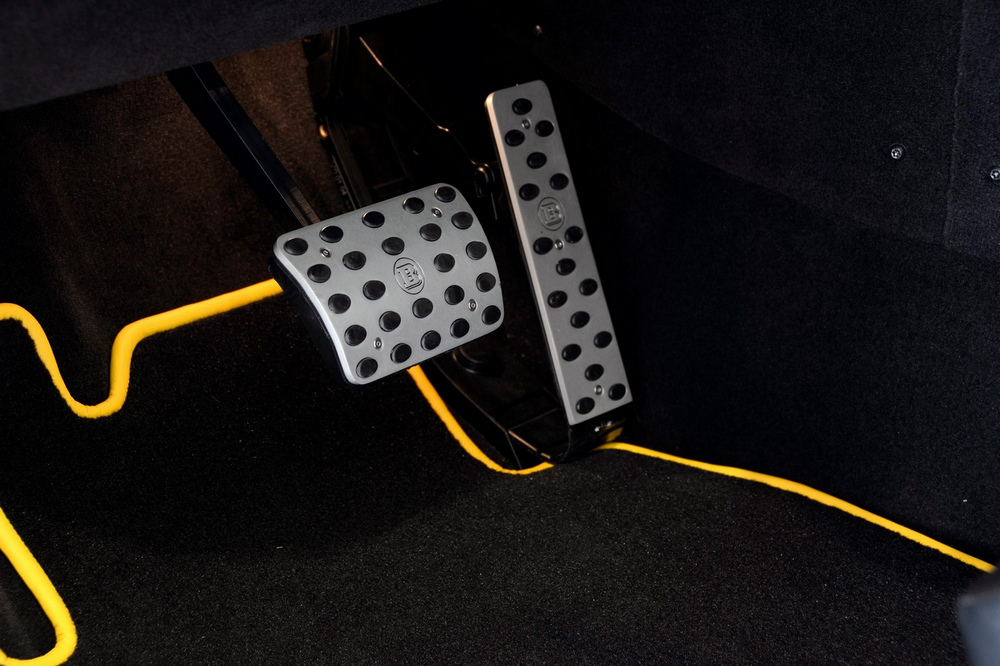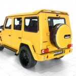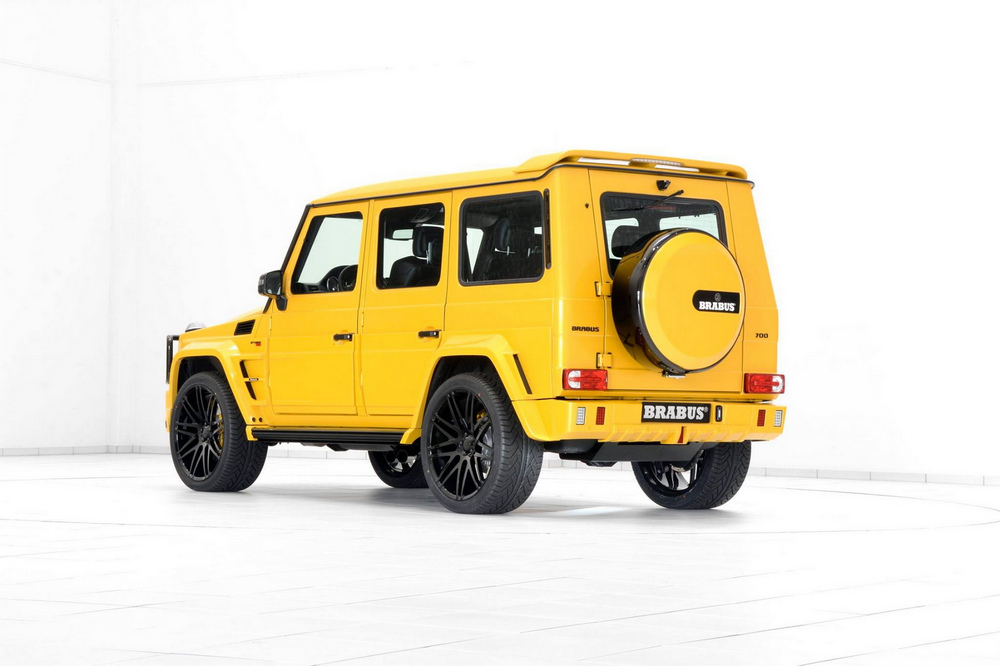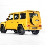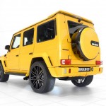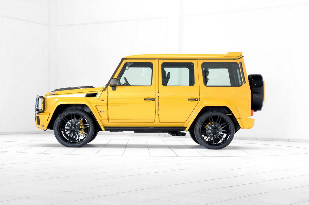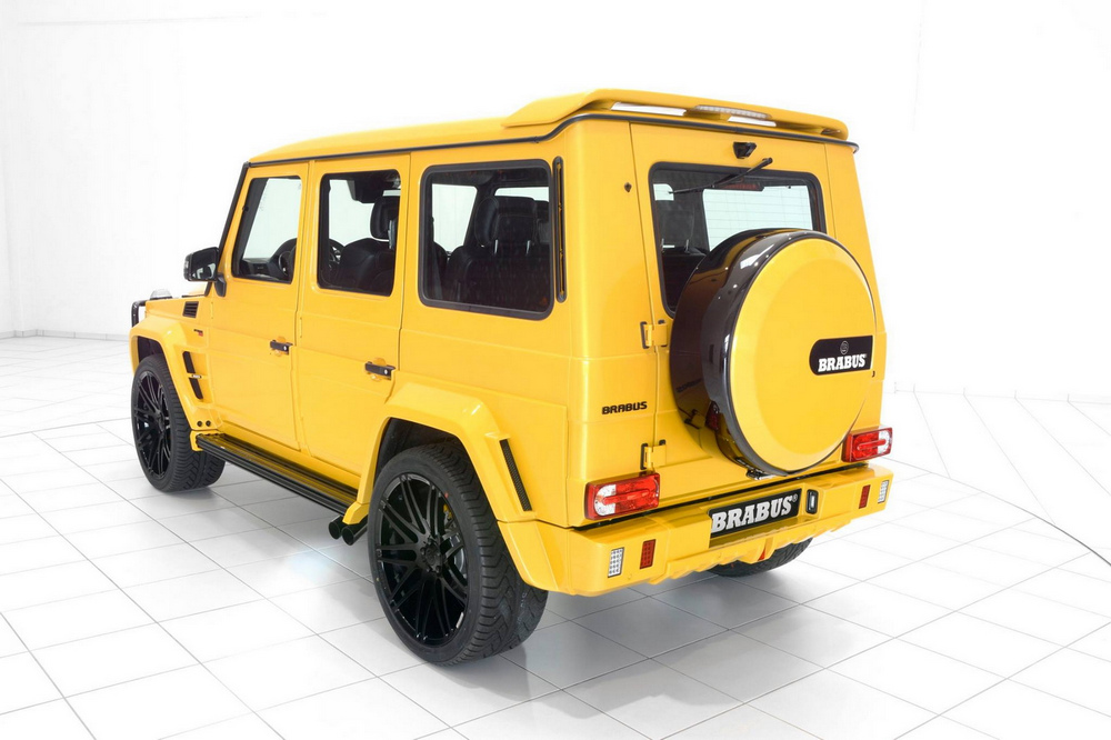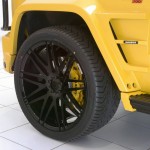 Cuenta con un kit aerodinámico compuesto por paragolpes, capó, aletas (añaden 12 cm a la ancho total- y un alerón trasero, un conjunto que se redondea con unas colosales llantas de aleación forjadas de hasta 23 pulgadas de diámetro -ya sabes, lo ideal para ir por el campo, con neumáticos en medida 305/35 R23-. Además, este Brabus G63 Widestar de color amarillo cuenta con un interior personalizado al gusto del cliente, con una llamativa tapicería de cuero y abundante fibra de carbono.