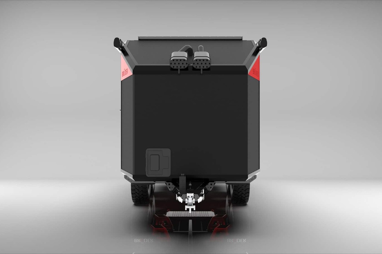 La caravana de Bruder monta unas llantas de 18 pulgadas con neumáticos de todoterreno de 37 pulgadas y utiliza una suspensión neumática con ocho amortiguadores. Está montada sobre un chasis hermético y la carrocería está completamente aislada del exterior, mediante una espuma de célula cerrada, que proporciona la máxima resistencia y durabilidad. Además, el techo está reforzado para soportar mucha nieve.
