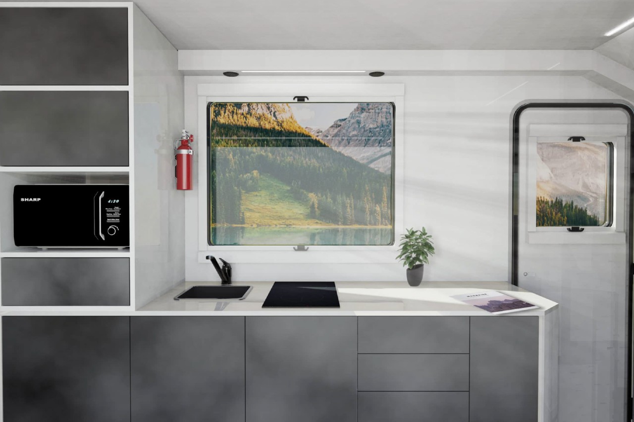 La cocina está equipada con una placa de inducción, un fregadero de acero inoxidable, una encimera de gran tamaño y muchos huecos de almacenamiento. La gran ventana de doble capa con persiana y malla contra insectos permite la entrada de mucha luz, lo que aumenta la sensación de espacio. Otras comodidades son el sofá en forma de L, la mesa deslizable, una nevera de 188 litros, iluminación de cuatro zonas y un ventilador.