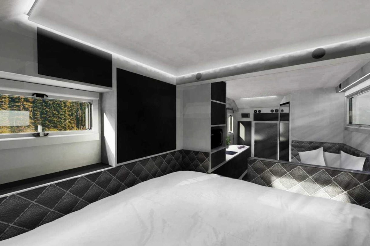 El interior de la caravana camper ofrece todo tipo de lujos y comodidades para disfrutar de unos días de descanso en cualquier parte del mundo. Presenta un salón comedor que podría ser el de cualquier apartamento y una habitación con cama para dos personas, todo en una atmósfera muy elegante y acogedora.