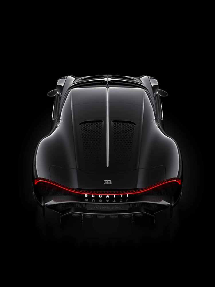La ventana delantera del Bugatti “La Voiture Noire”, con el parabrisas al centro y los pilares A integrados, está inspirado en el del Type 57 SC Atlantic. Conserva los pasos de aire laterales para el enorme motor W16, mientras que la zaga ha prescindido del cristal trasero y ha sido completamente rediseñada para integrar una fina línea de luz LED que recorre todo el ancho del coche, sobre un agresivo difusor trasero con seis salidas de escape.