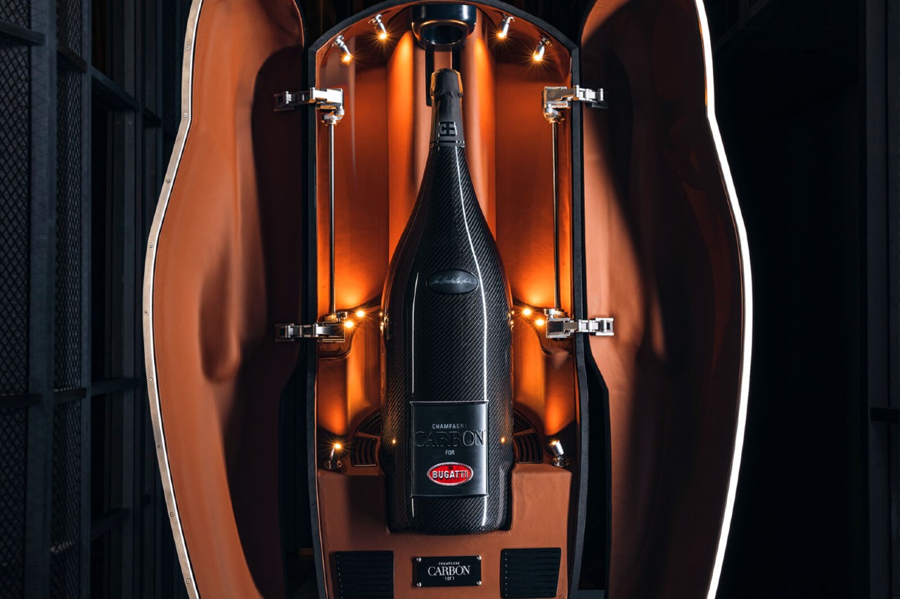 Bugatti y Champagne Carbon han trabajado para crear una botella de fibra de carbono de 15 litros, resultado de 150 horas de trabajo artesanal que implica 37 pasos, dentro de una caja escultórica que la protege. La botella se inspira en La Voiture Noire y en la elegancia del Tipo 57 SC Atlantic. La caja hecha a mano presenta unas superficies puras y limpias, con una estructura de fibra ultrafina oculta debajo de la superficie negra.