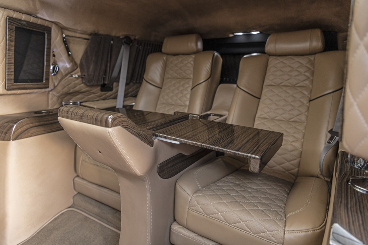Pero esto no es todo. El especialista en coches blindados ha trabajado también en el interior del SUV de Cadillac y lo ha equipado con una lujosa cabina. Destacan los dos asientos para los pasajeros de las plazas traseras, con calefacción, refrigeración y función masaje. El compartimento de los pasajeros está separado de la cabina del conductor y tiene dos asientos desplegables adicionales para ampliar el número de pasajeros.