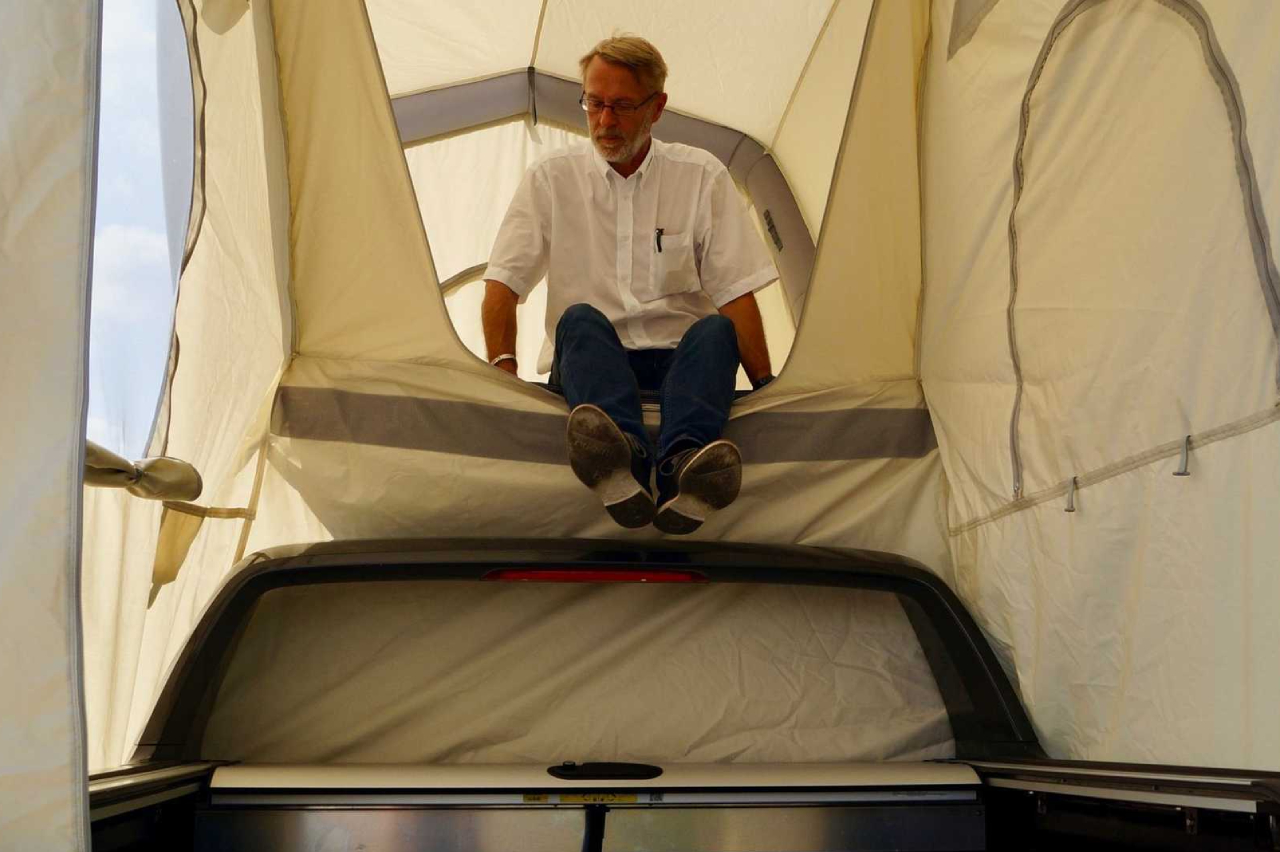 El diseño de la GentleTent GT Pickup proporciona un espacio amplio y cubierto que se distribuye en dos estancias. La primera de ellas es una sala de estar que ocupa la caja de la camioneta transformándola en un espacio habitable que mide dos metros de alto y 1,5 de ancho. En la parte superior, encima del techo, encontramos el segundo espacio: un área para dormir que puede contener un colchón de tamaño completo.