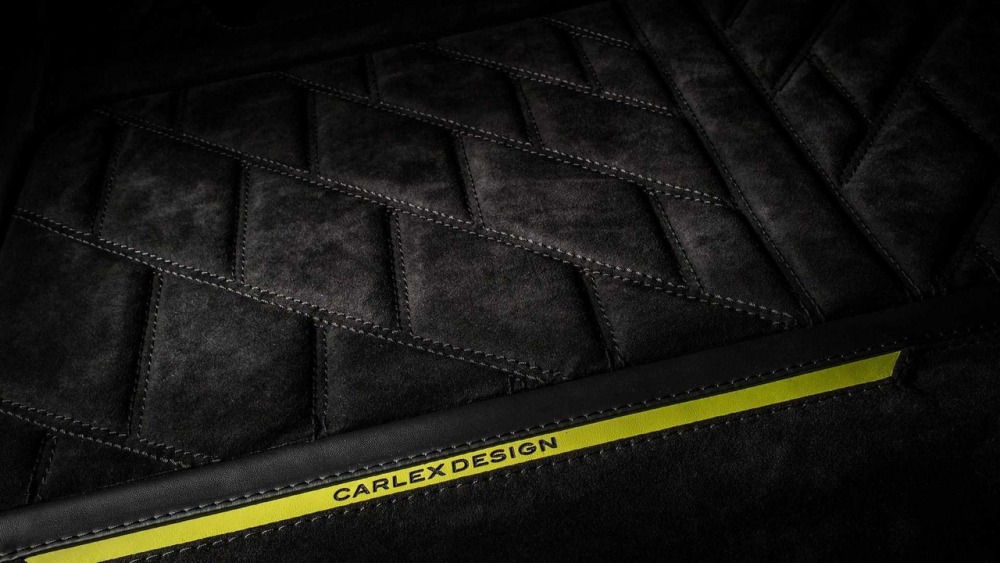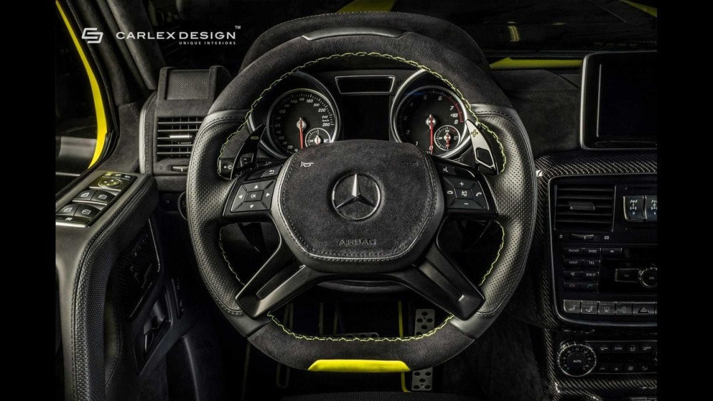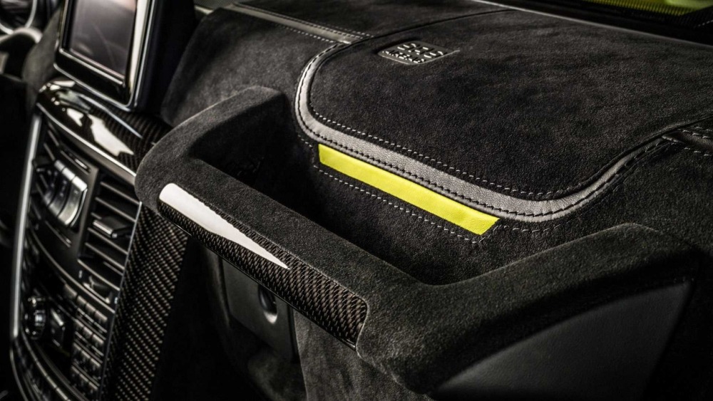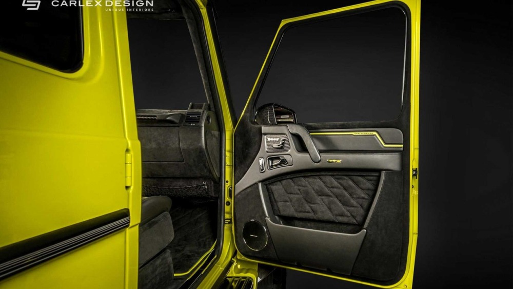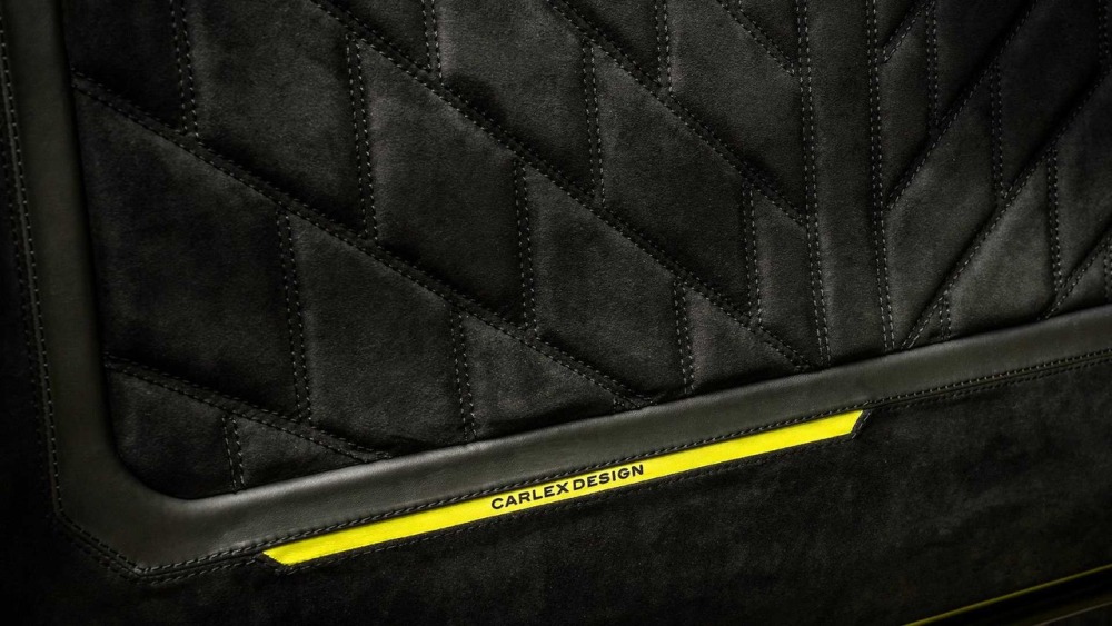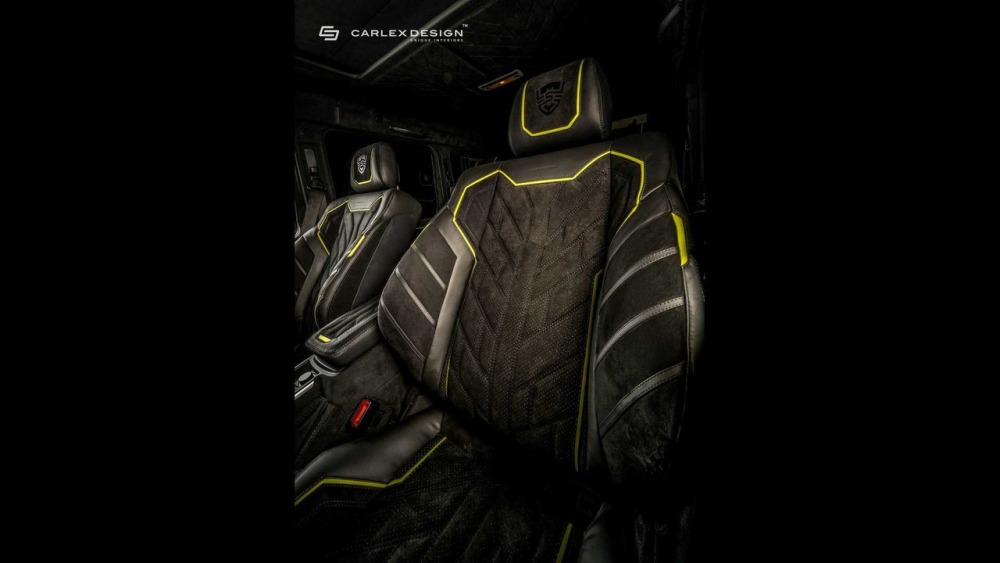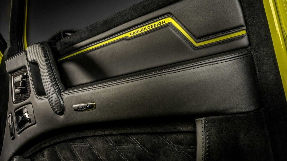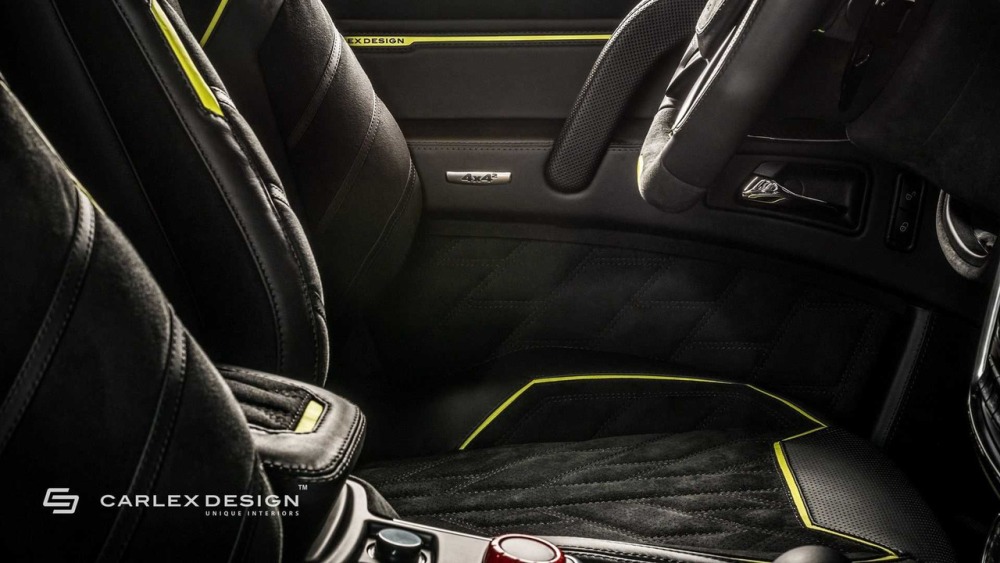 Carlex asegura que el objetivo principal cuando se trabaja en el interior de este G500 4x4² es crear “un aspecto deportivo y moderno con acentos aludiendo al color de la carrocería”. La mayoría de las superficies en el habitáculo están cubiertas de cuero Alcántara perforado con algunas inserciones de cuero tradicional. Además, las inserciones de fibra de carbono en el salpicadero están a la orden del día en esta preparación.
