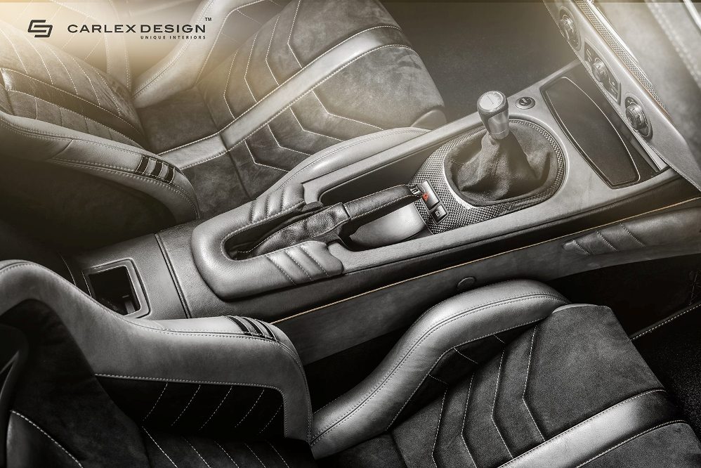 El interior es una muestra distintiva del carácter y estilo de Carlex. Una combinación de cuero Alcántara negro y piel de búfalo, así como piezas de fibra de carbono pintadas a mano. El juego de colores se repite en el habitáculo, además de las costuras visibles en los asientos, paneles de las puertas, volante, consola central y salpicadero. Sin duda los asientos otorgan la nota de deportividad que nos introduce en la preparación que esconde bajo el capó.