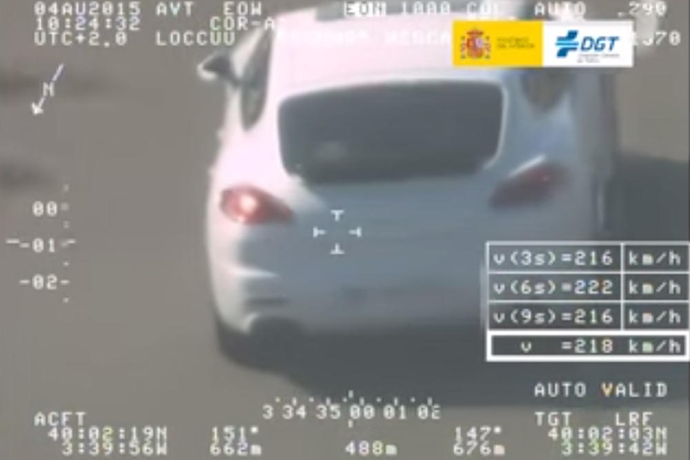 Pegagus, uno de los helicópteros de la DGT equipados con sistemas de medición de la velocidad, ha cazado a un conductor circulando a 218 km/h con un menor a bordo sin sujeción. El detenido, un español de 31 años de edad que conducía un Porsche Panamera con matrículas francesas, fue sorprendido en la autopista de peaje R-4 a la altura del kilómetro 31, una vía que como otras de sus características, está limitada a una velocidad máxima de 120 km/h.