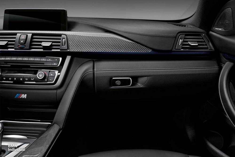 El más evidente de ellos es el color Azul ‘Macao’ metalizado, un tono que coincide con el que lucía la carrocería del primer vehículo M de este comprador (no conocemos su identidad, tan sólo sus iniciales, JHS). Además, este M4 Coupé de BMW Individual cuenta también con una serie de accesorios de BMW M Performance (no te pierdas nuestra prueba del BMW Serie 4 M Performance), como el faldón delantero de fibra de carbono, la parrilla delantera o el alerón ubicado sobre el portón del maletero, también fabricado con este ligero material. Además, sobre el techo podemos ver una pequeña franja con los colores característicos del departamento de altas prestaciones de la firma alemana.