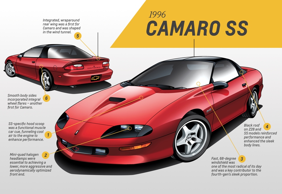 Cuando en 1993 nace el Chevrolet Camaro de cuarta generación, las líneas angulares y su diseño más clásico se habían reinventado. Su diseño, muy agresivo, estaba destinado a evolucionar las proporciones de la generación pasada con un rendimiento aerodinámico mayor. Ejemplos de ello son el parabrisas inclinado, motor refrigerado desde la parte más baja del frontal y un aspecto exterior en forma de cuña. Kirk Bennion, director de diseño exterior del Chevrolet Camaro, se encarga de analizar la versión SS de 1996.