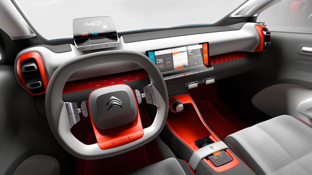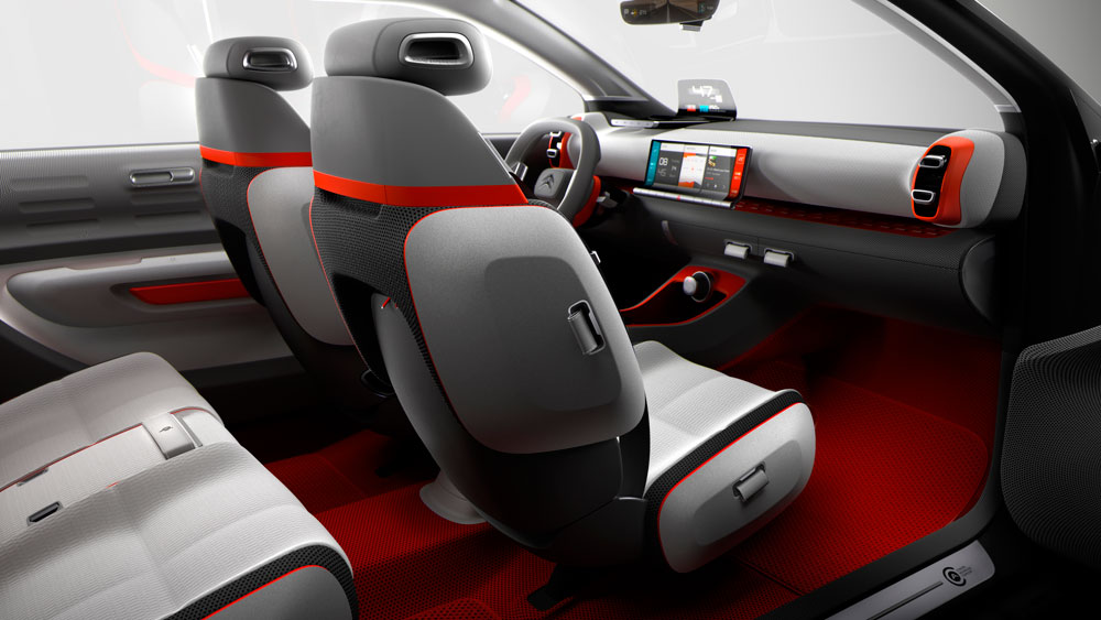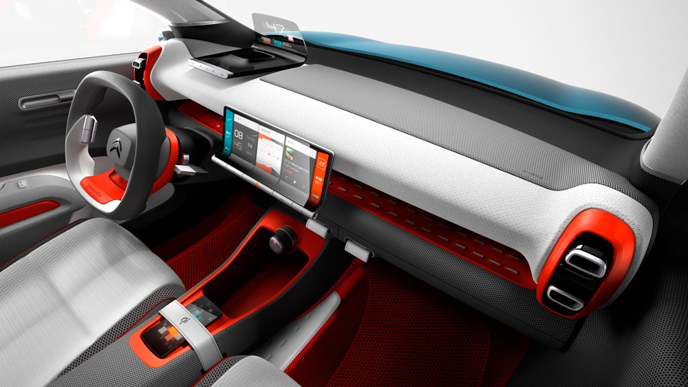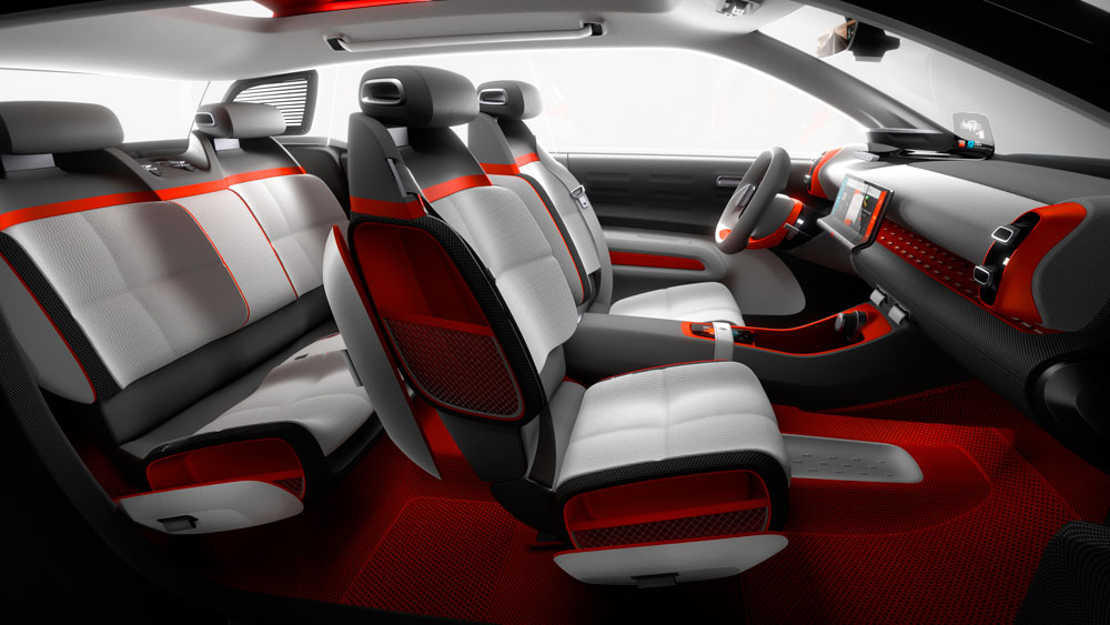 El acceso al habitáculo se simplifica gracias a la ausencia de pilar B, algo que es poco probable que llegue al coche de producción. Destaca la combinación de colores y materiales, así como algunos elementos propios de un estudio de diseño; por ejemplo, el cuadro de instrumentos es proyectado gracias a un head up display de grandes dimensiones, mientras que el volante es monobrazo, un claro guiño a los coches de la casa que se comercializaron en el pasado. Asimismo, equipa un salpicadero aéreo y unos asientos suspendidos. No podemos olvidar la gran pantalla táctil de 12 pulgadas del sistema de infoentretenimiento.